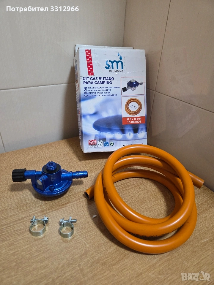 Чисто нов комплект за свързване на газ бутан за къмпинг, марка SM Plumbing. Съдържание: Включва редуцир-вентил (регулатор) и маркуч. Размери на маркуча: Диаметър  9×159 cross 15 𝟗×𝟏𝟓 мм и дължина 1,51 comma 5 𝟏,𝟓 метра.