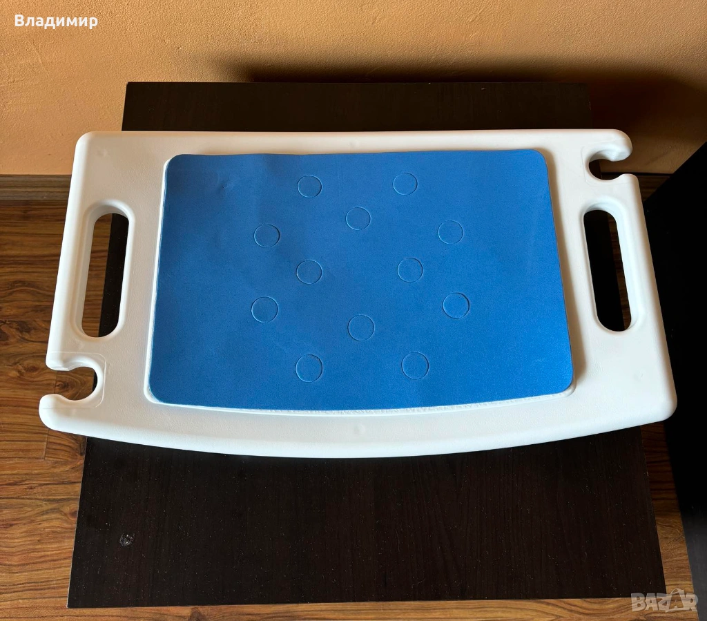 Столът осигурява стабилност и удобство при използване на банята за къпане. Има синя подложка, която се залепя на седалката, осигурява допълнителен комфорт и предпазва от хлъзгане.