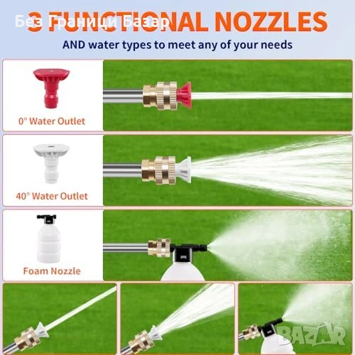 Комплект: водоструйка, 2 батерии, зарядно, 5 м маркуч, пенообразувател, удължител, 2 накрайника, конектор, кофа, ръководство