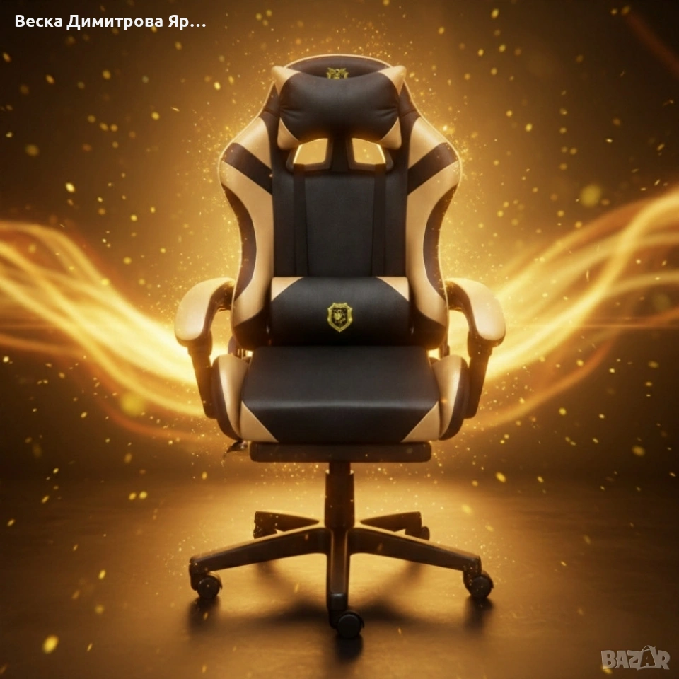 Геймърски стол с масажна функция, лумбална възглавница и поставка за крака – Черен-златист