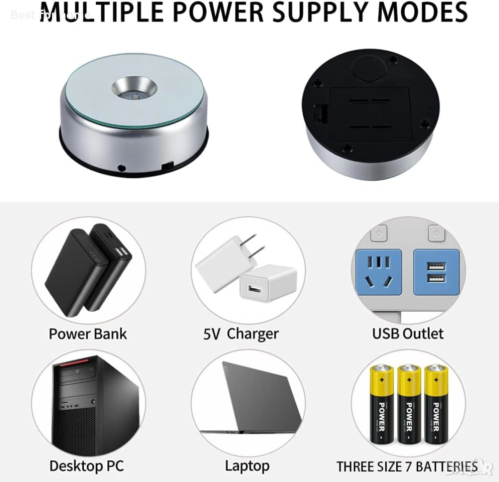 2 начина на захранване — Тази въртяща се основа за дисплей може да бъде свързана към източник на захранване с помощта на включения USB кабел. Работи и с батерии (не са включени).