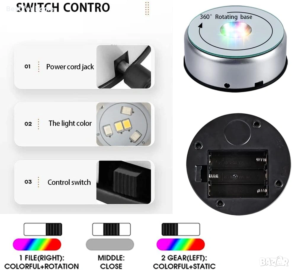 Ефект на въртене на 360 градуса — Въртящата се стойка на тази основа за арт осветление ви позволява да разглеждате изложените артикули на 360°. Тиха работа без шум.