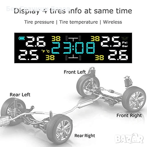 Ясен дисплей с данни за 4-те гуми наведнъж и функция часовник