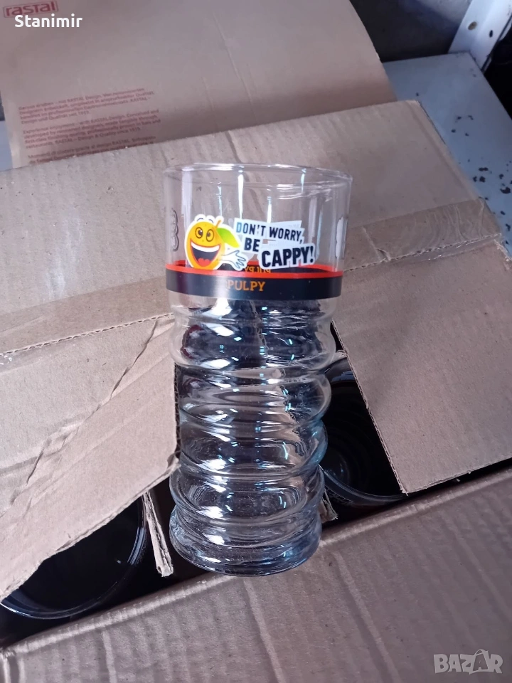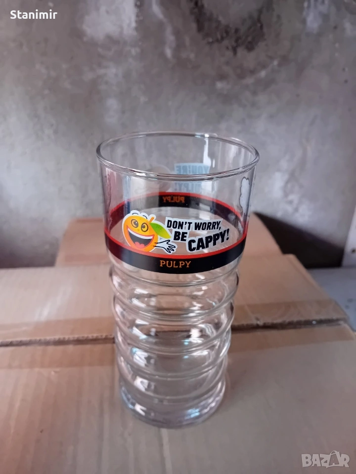 Нови стъклени чаши с надпис 'Don't worry, be cappy!' и изображение на весел герой. Чашата е част от колекцията 'Pulpy' и е подходяща за употреба в домакинството. Комплект от 6-бр. 350мл.