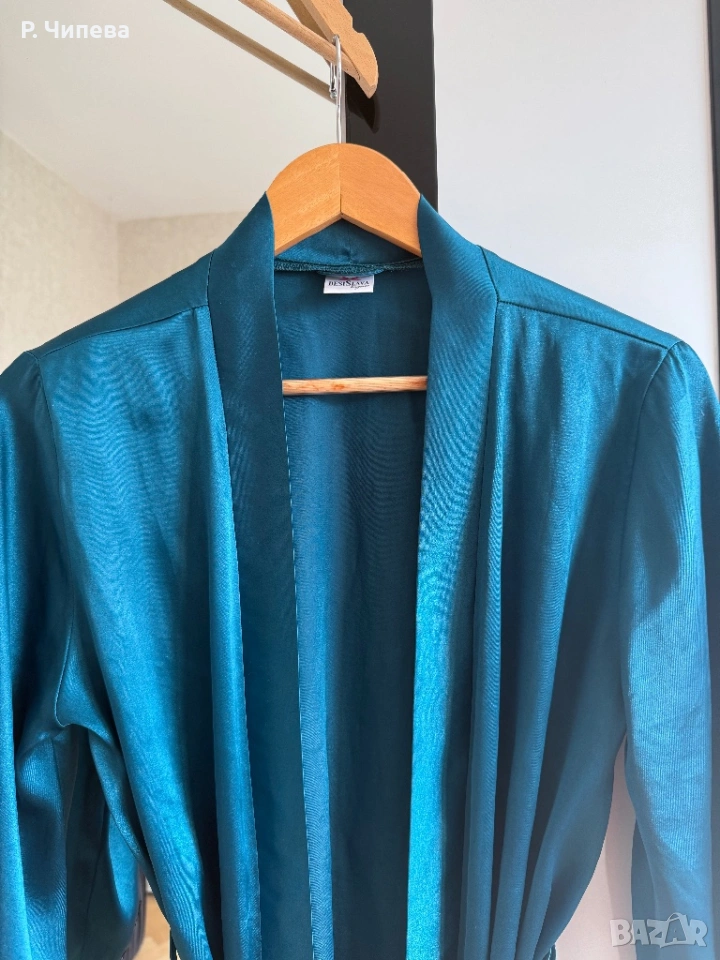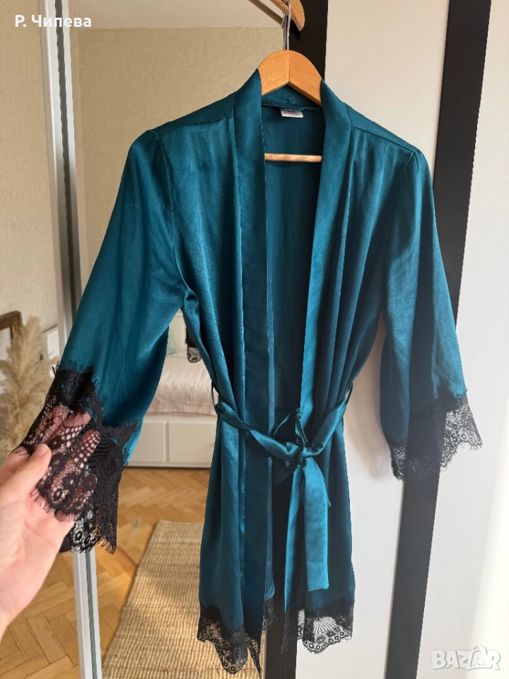Сатенен халат в цвят петрол с черна дантела 🖤 → Обява 53697786