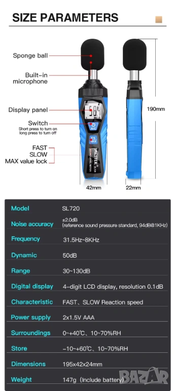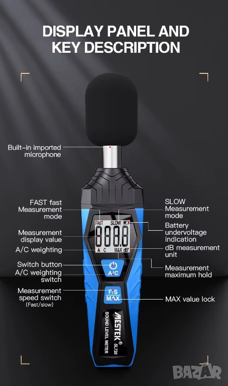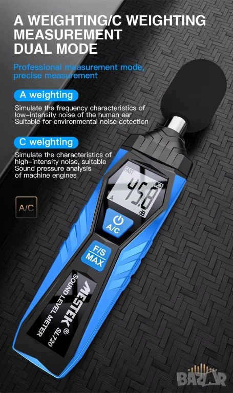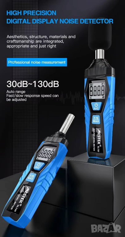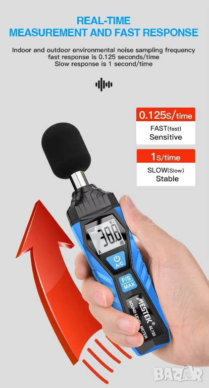 Професионален шумомер SL720 от MESTEK, предназначен за измерване на нивото на звуковото налягане в различни производствени, лабораторни и експлоатационни условия. Уредът предлага висока точност и широк измервателен обхват, което го прави подходящ инструмент за акустични инспекции, контрол на околната среда и индустриални приложения.