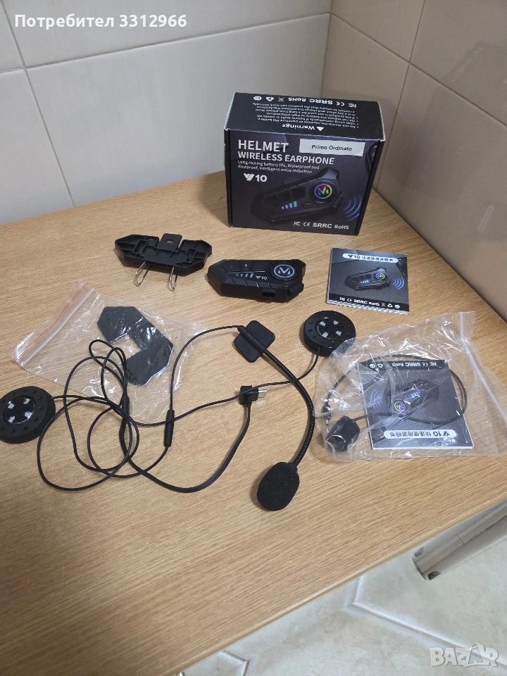 Чисто нова безжична Bluetooth слушалка за каска (модел V10), предназначена за мотоциклетисти. Разполага с интелигентно намаляване на шума за по-ясна комуникация. Устройството е водоустойчиво, което го прави подходящо за употреба при различни метеорологични условия.
