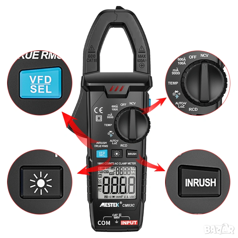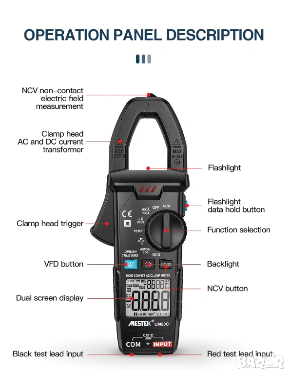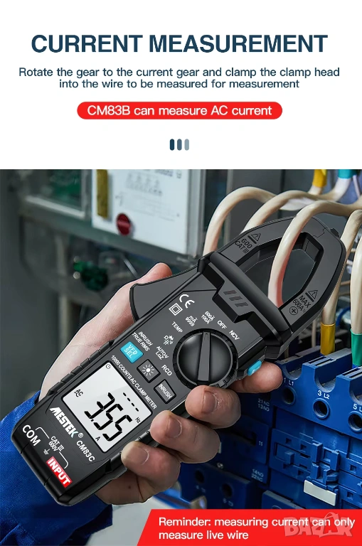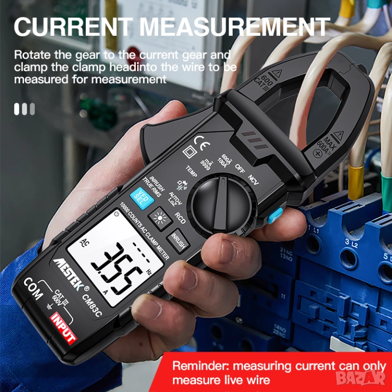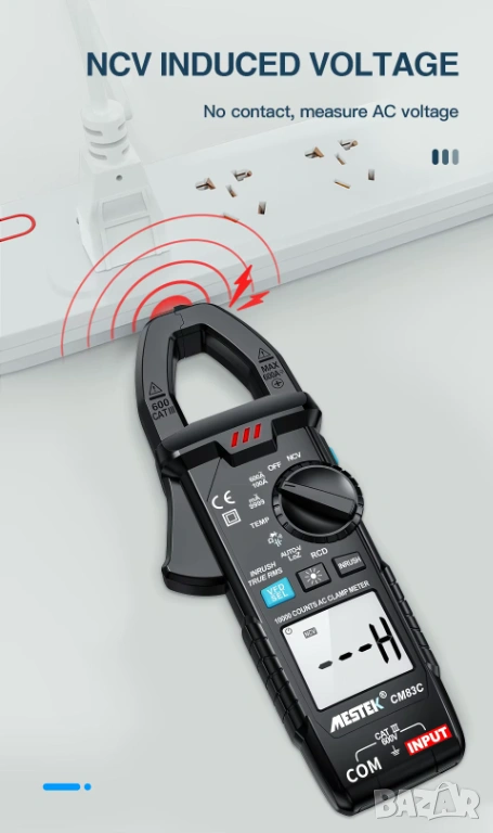 Професионален цифров амперметър с клещи MESTEK CM83C, оборудван с функция за измерване на AC/DC ток до 600 A и вградена възможност за измерване на температура (с K-тип сондa). Този мултифункционален прибор съчетава в себе си множество измервателни режими, надеждност и точност, подходящи за диагностика и поддръжка в електрически, инженерни и сервизни приложения.