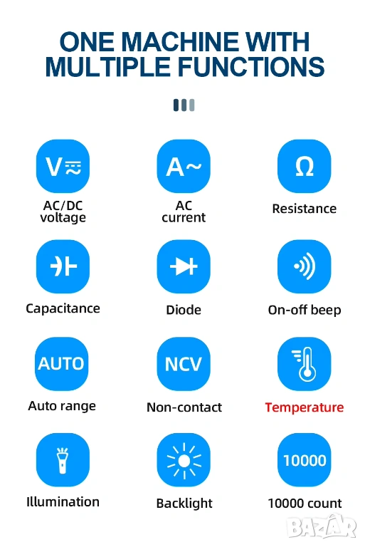 Функции: Data Hold, подсветка на дисплея, вграден LED фонар