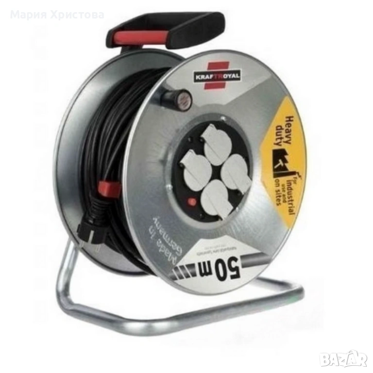 Електрически удължител с макара KraftRoyal 50m — здрава поцинкована конструкция, 4 гнезда и термична → Обява 53699268