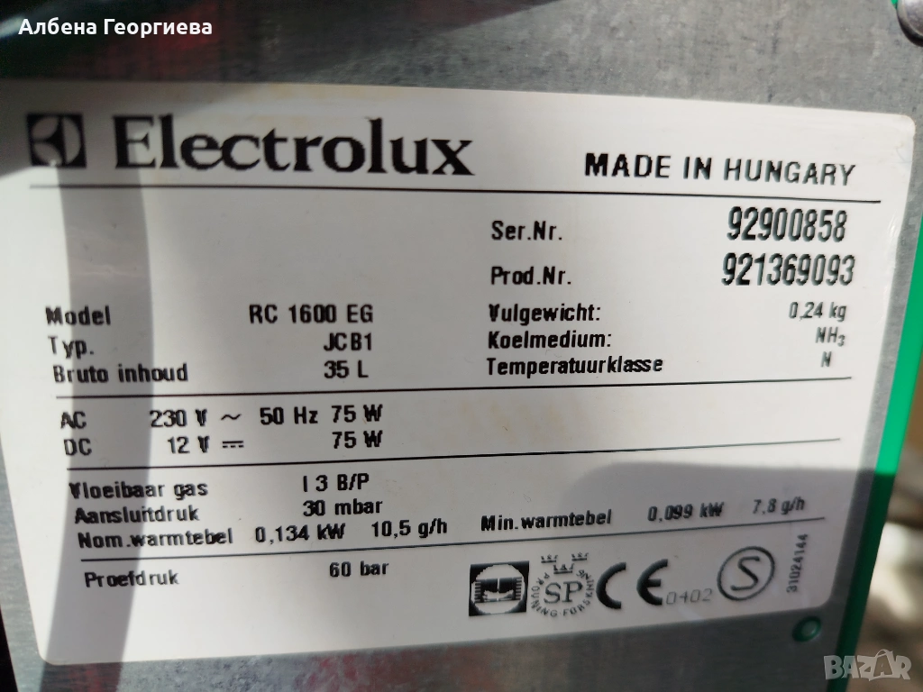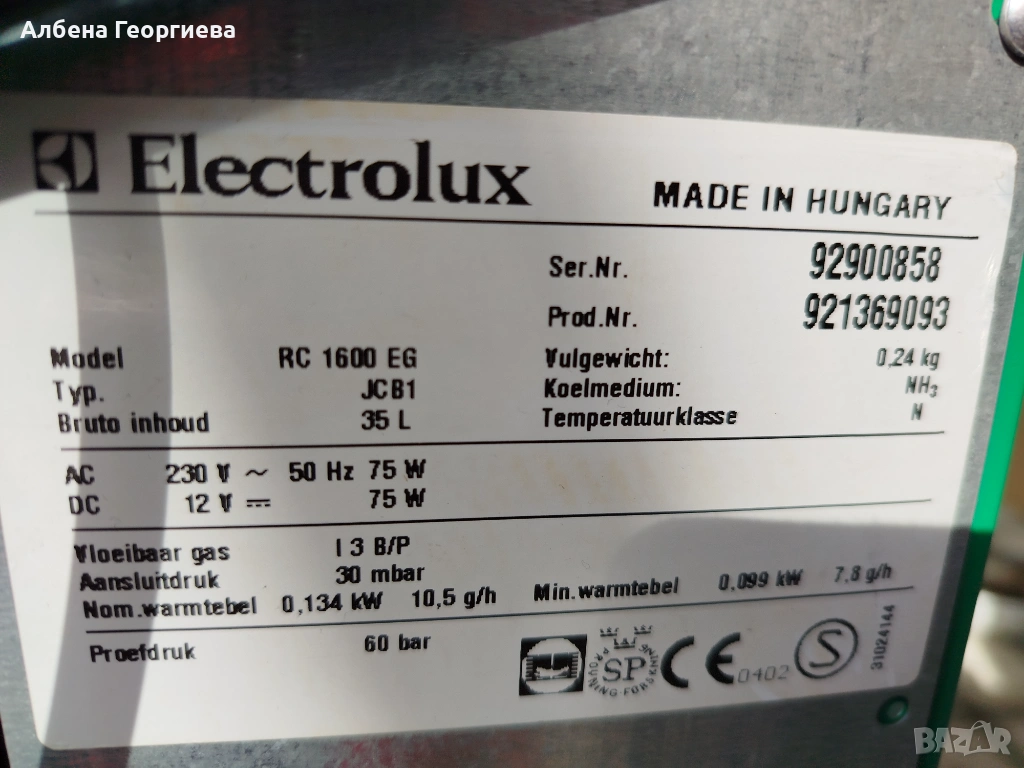 Амонячният хладилник Electrolux е проектиран за работа в мобилни условия (кемпери, каравани) или на места без постоянно електричество, като поддържа три режима на захранване: 12V DC, 220V AC и пропан-бутан (GAZ).Работи добре на /- 4.3 /градуса показано на снимките и пламъка на газ .