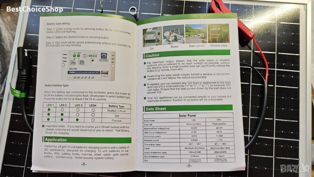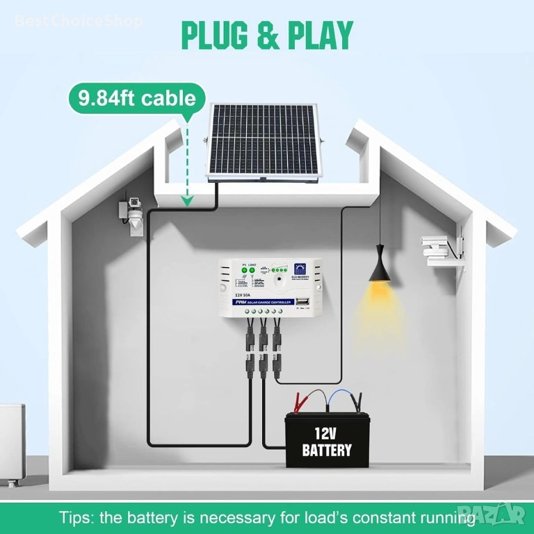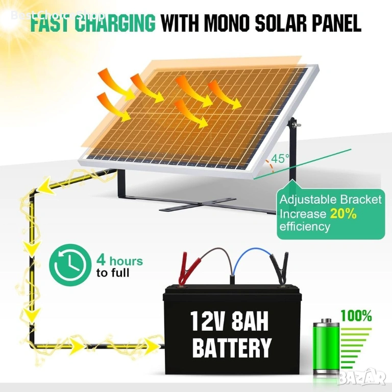 · Широко използван: Идеален комплект за слънчева енергия за различни приложения извън мрежата, включително кокошарници, отварящи порти, водни помпи, навеси, кабини и др., където се използва 12V батерия с дълбок цикъл, както и за зареждане и поддръжка на автомобили, кемпери, лодки, батерии на ремаркета.
