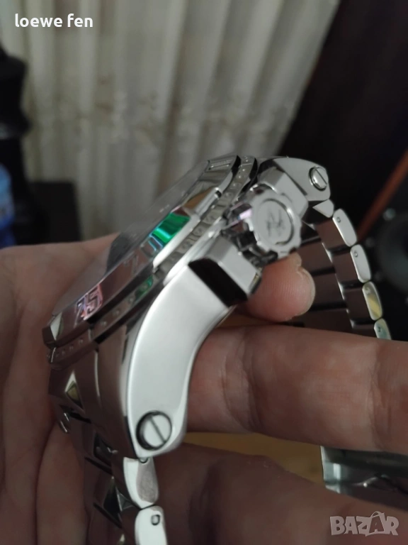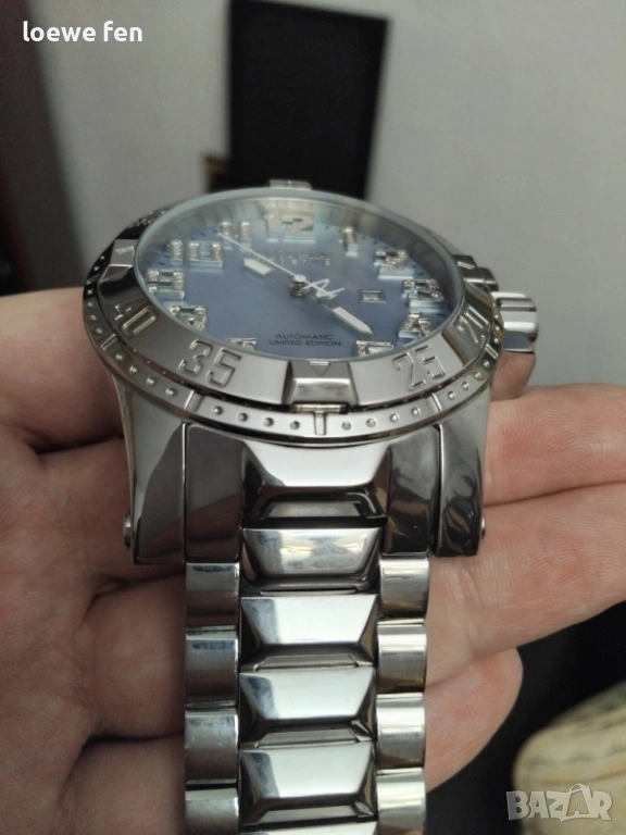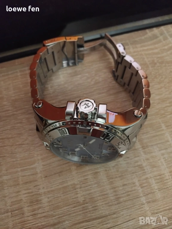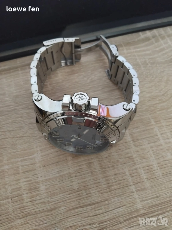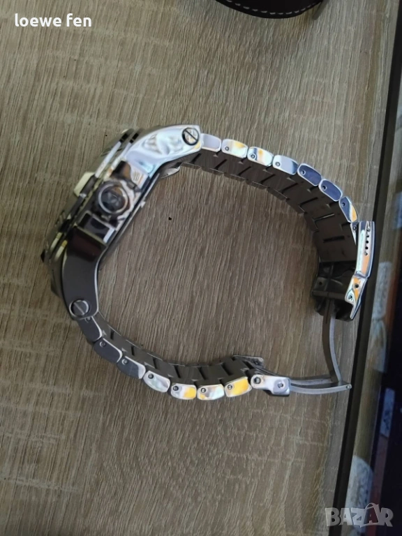 Един от Топ моделите на Инвикта ! Като Нов! В нета има достатъчно информация за него! Веригата е 28 мм и е дебела около 6 мм...закрепена е за часовника с болтове...короната е на винт !