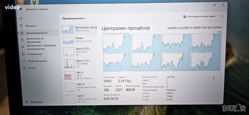 Процесор: Intel Core i5-8300H (4 ядра / 8 нишки) с честота до 4.0GHz. Мощна серия процесор, подходящ за по-тежки задачи.