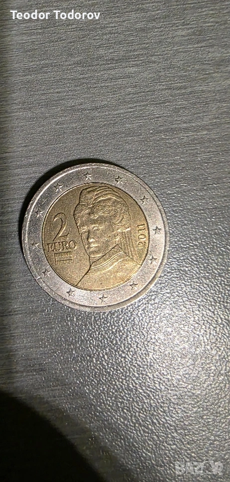 Това е австрийска монета от 2 евро, изсечена през 2011 г. Дизайн: Изобразява портрета на Берта фон Зутнер, австрийска пацифистка и носителка на Нобелова награда за мир.