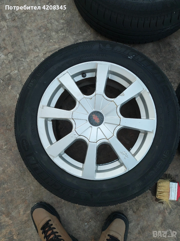 Идеално прави, здрави, алуминиеви джанти,които няма да тресат, имат само козметични забележки. 15' цола, 4х100, ЕТ 35. Гумите са 185/65/15, две са Мишелин, две са Ласа, за смяна са, но не извънредно спешна, ще бутнат месец през пролетно-летен сезон до монтажа на други.