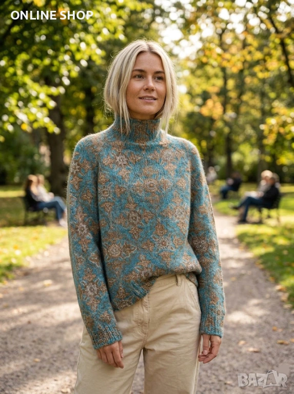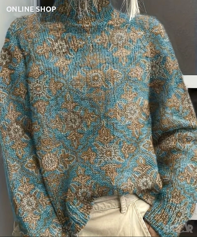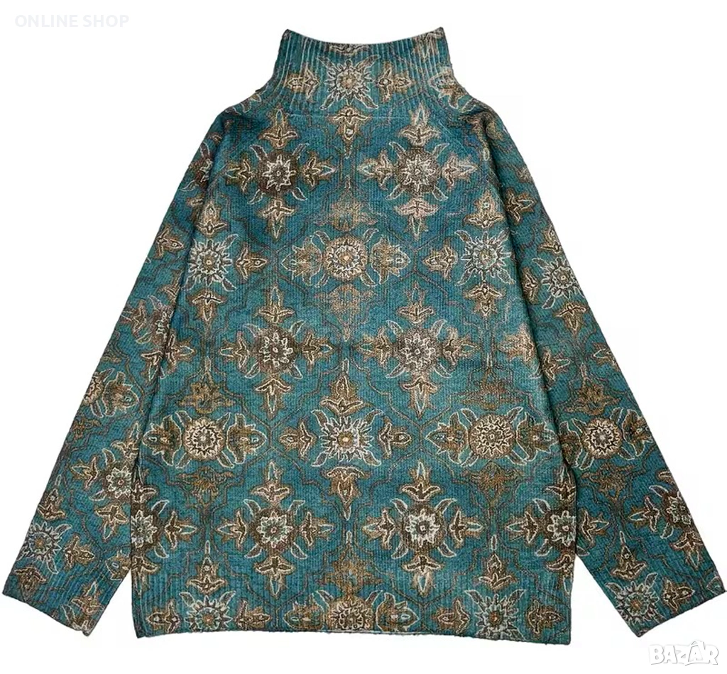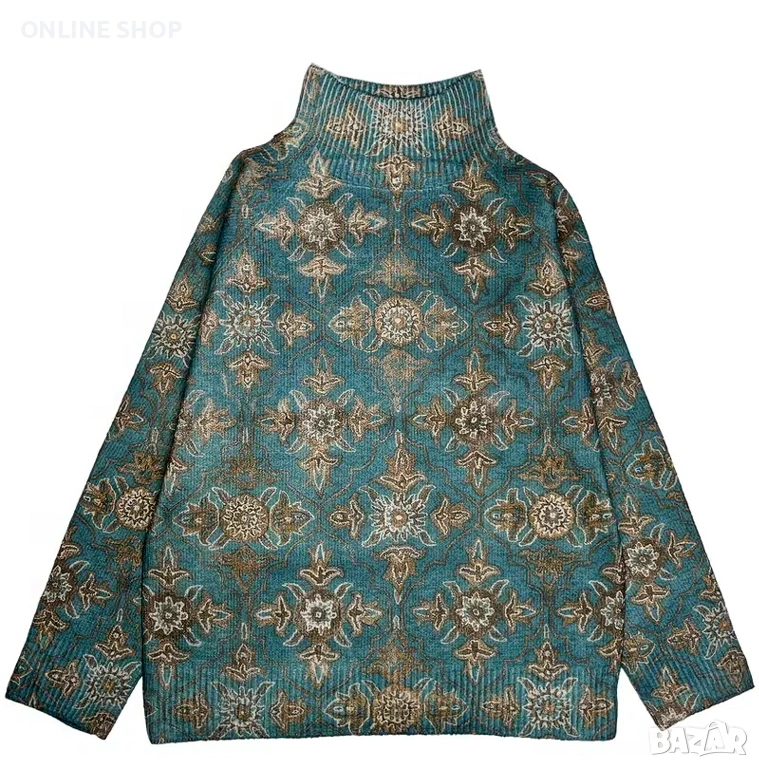 Добавете нотка на непреходна елегантност и винтидж шик към гардероба си с този изящен дамски пуловер. Моделът се отличава с уникален цял геометричен принт в меки, смесени цветове, които напомнят за класическата естетика на 70-те години. Високата яка (поло) не само придава изтънчен вид, но и осигурява уют и топлина през всички сезони.