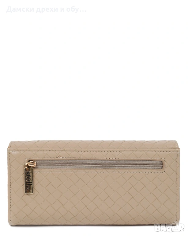 Стилно дамско портмоне в елегантен бежов цвят с външен джоб и преден капак с ватирана текстура. Изработено от висококачествена изкуствена кожа, идеално за ежедневна употреба.