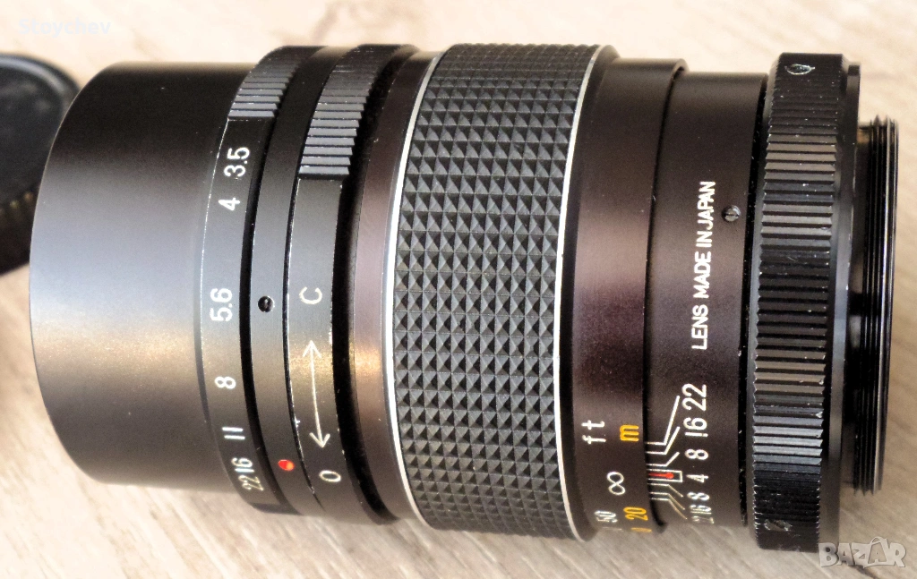 Kimunor 135mm 1:3.5. Т2 монтаж, накрайник резба М42. Made in Japan. Бленда пресет с 10 лавема. Състояние като нов. Корпус без следи от употреба, чиста оптика, мек ход на фокус пръстена, работеща бленда. Две капачки