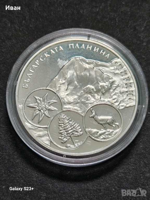 Продавам сребърна монета 10 лева от 2007 година,Пирин,23.33 грама с чистота 925/1000 и тираж 6000 броя