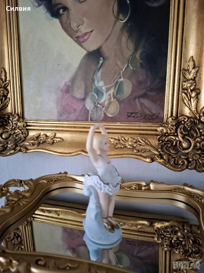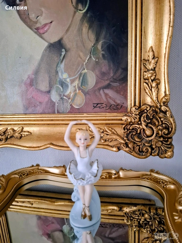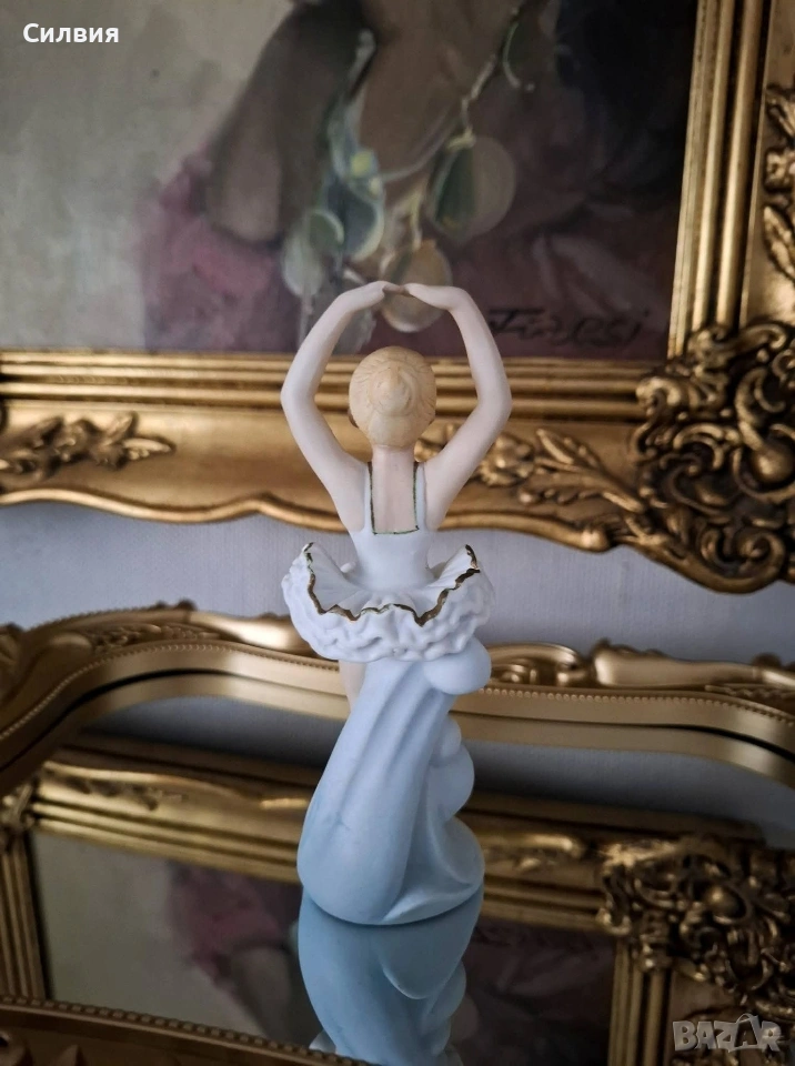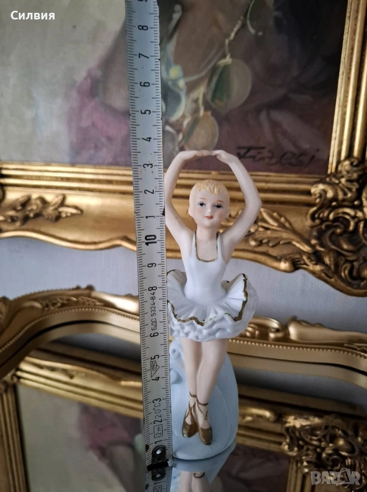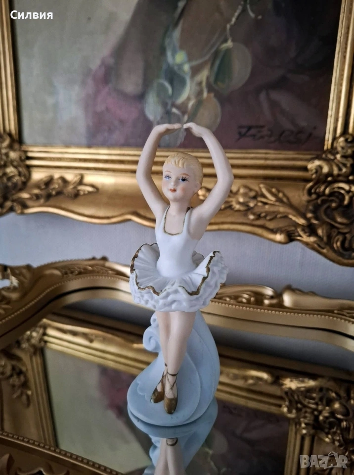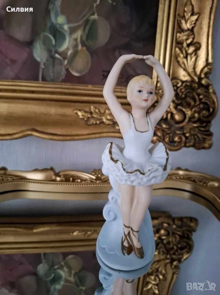 Очарователна Порцеланова Фигурка на Балерина Статуетка на балерина в класическа танцова поза, с ръце грациозно вдигнати над главата (позната в балета като 5^{та} позиция en haut). Това е прекрасен декоративен артикул, идеален за колекционери или като подарък за танцьор. Балерината е изобразена в класическо бяло туту с деликатен златист кант по ръба на волана. Косата ѝ е оформена на кок, а краката ѝ са обути в кафяви палци. Позата ѝ е елегантна, сякаш стои en pointe (или го имитира) върху декоративна основа, която прелива във воалите на роклята. Материал: Порцелан (biscuits ) Височина 14,3см. Цена 2️⃣0️⃣€ 39,12лв •✽✧✽•°”˜🦋”°•✽✧✽•°”˜🦋”°•✽✧✽•°”˜🦋”°•✽✧✽•°”🦋˜”°•✽✧✽•