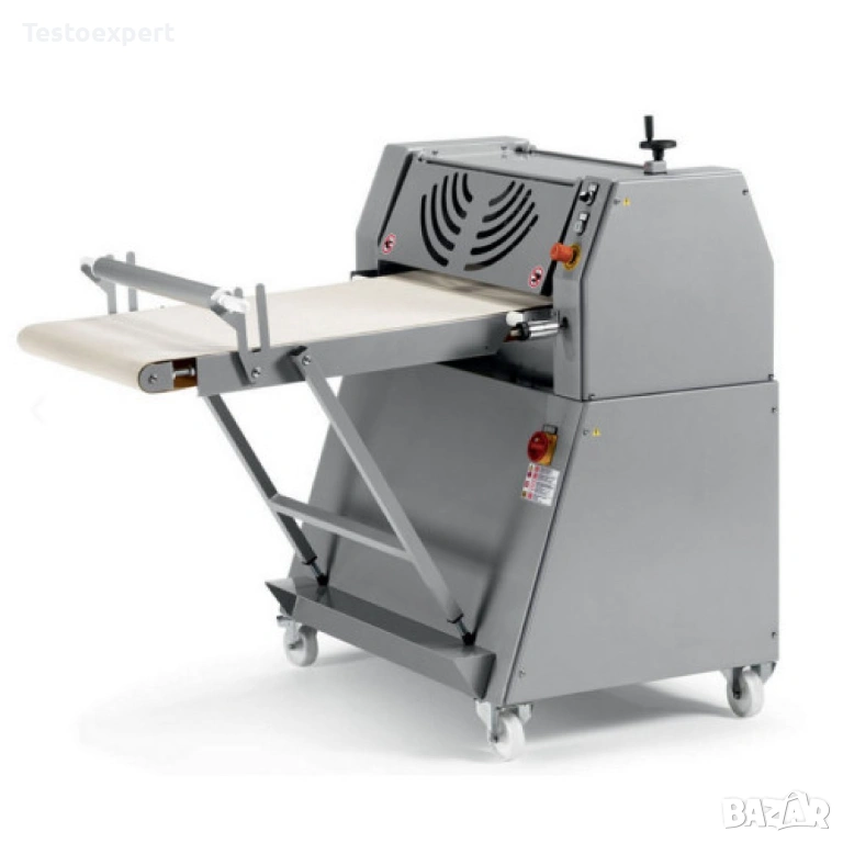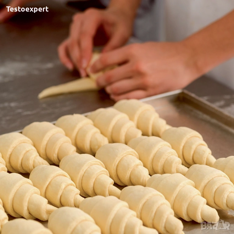 Автоматична машина за производство на кроасани – професионално решение за пекарни и производствени линии с високо натоварване. Машината осигурява капацитет до 2000 кроасана на час и работи с тесто с тегло от 25 до 120 г, което позволява гъвкаво производство. Оборудвана е с регулируеми цилиндри за калибриране, двустепенно рязане на тестото против залепване и регулируеми ленти за оформяне. Скоростта се контролира чрез инвертор, а защитните системи гарантират безопасна работа. Конструкцията на колела улеснява позиционирането и почистването.
