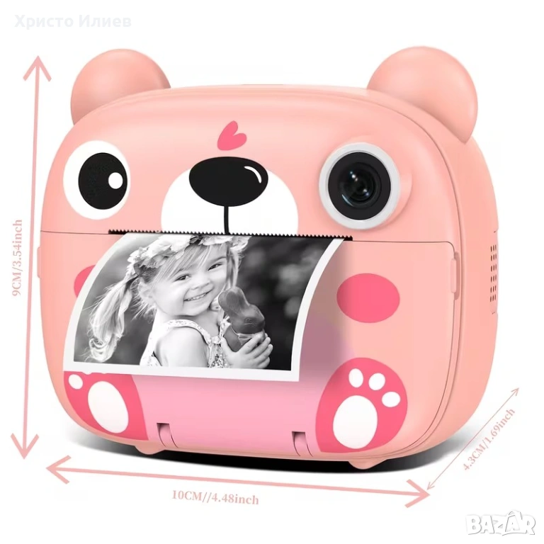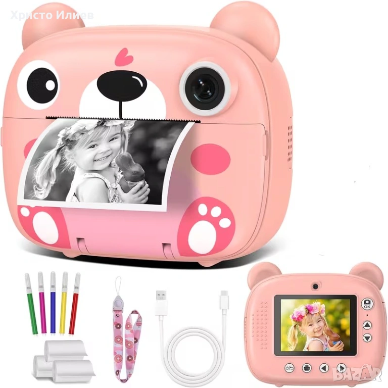 Той има екран и камера, а от долната част излиза принтирана снимка. Фотоапаратът е идеален за деца, които искат да правят снимки и веднага да ги отпечатват. Устройството е лесно за използване и предлага забавление за малките фотографи.