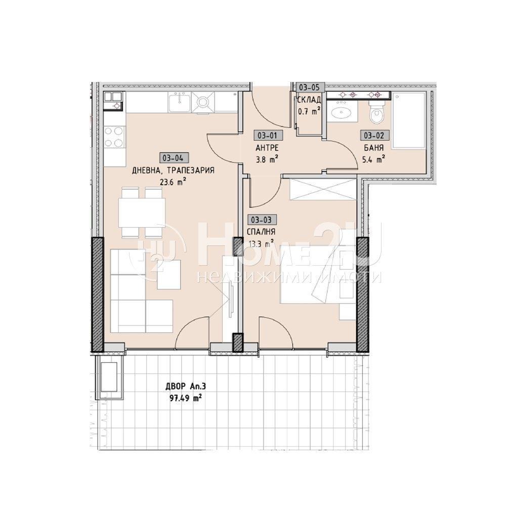 АКТ 15 !!! ВИСОК КЛАС СТРОИТЕЛСТВО !!! ПРАВИЛНИ ФОРМИ !!! Home2U представя на Вашето внимание, двустаен партерен апартамент в бутикова сграда от висок клас в ж.к. Малинова долина ПРЕД АКТ 16! Сградата е разположена в много тихата част в близост до магазин Фантастико, Кауфланд, близост до бъдеща метростанция и бърза връзка към бул. Симеоновско шосе и Околовръстен път. Функционално разпределение на имота: входно антре, всекидневна с кухненски бокс, спалня и баня с тоалетна, склад и голям балкон. За Ваше улеснение прилагаме схема на разпределение на имота. Всички апартаменти са с изградена шумоизолация на пода, смарт врати с пръстов отпечатък и допълнителна изолация между всяка стена. Ако желаете да закупите този имот, обадете се СЕГА и цитирайте следниня код: 131934