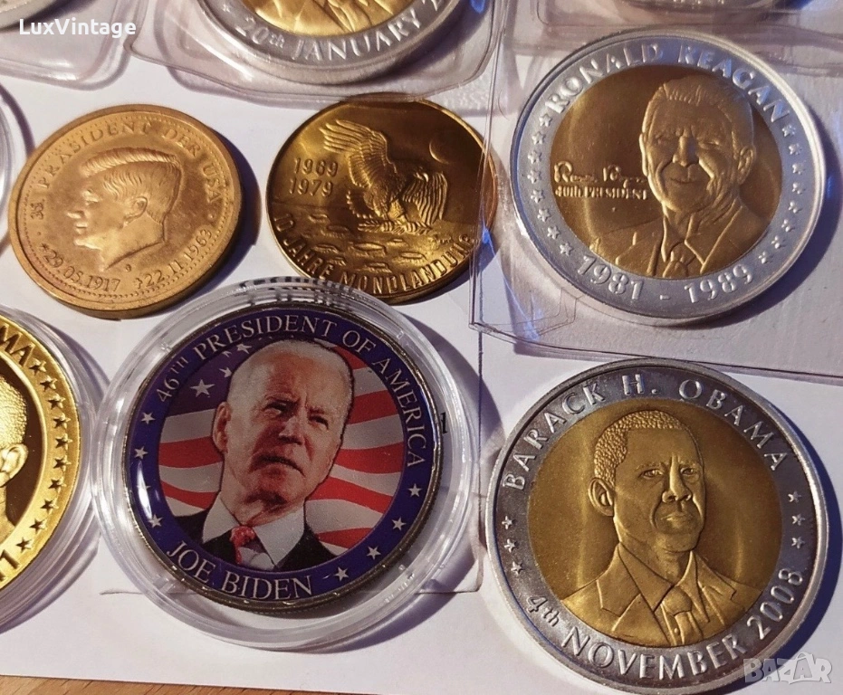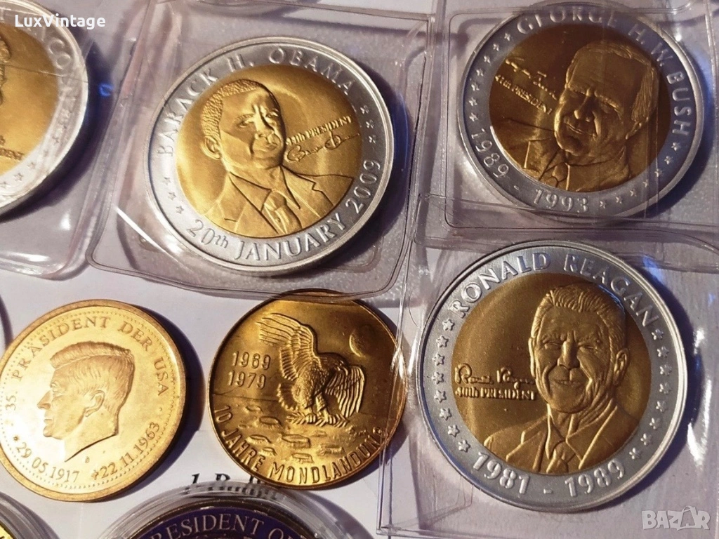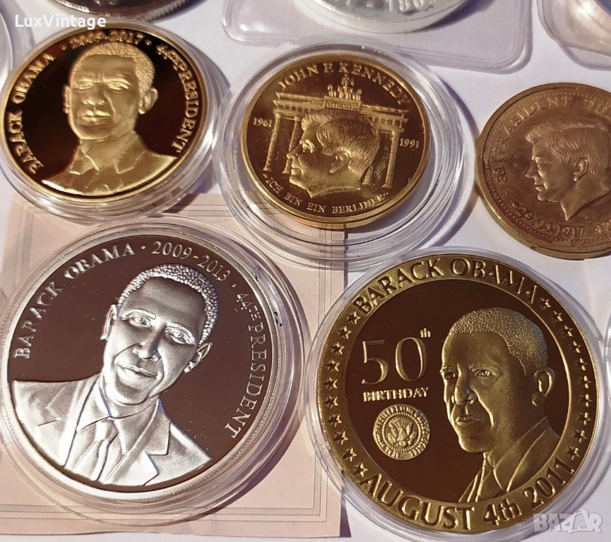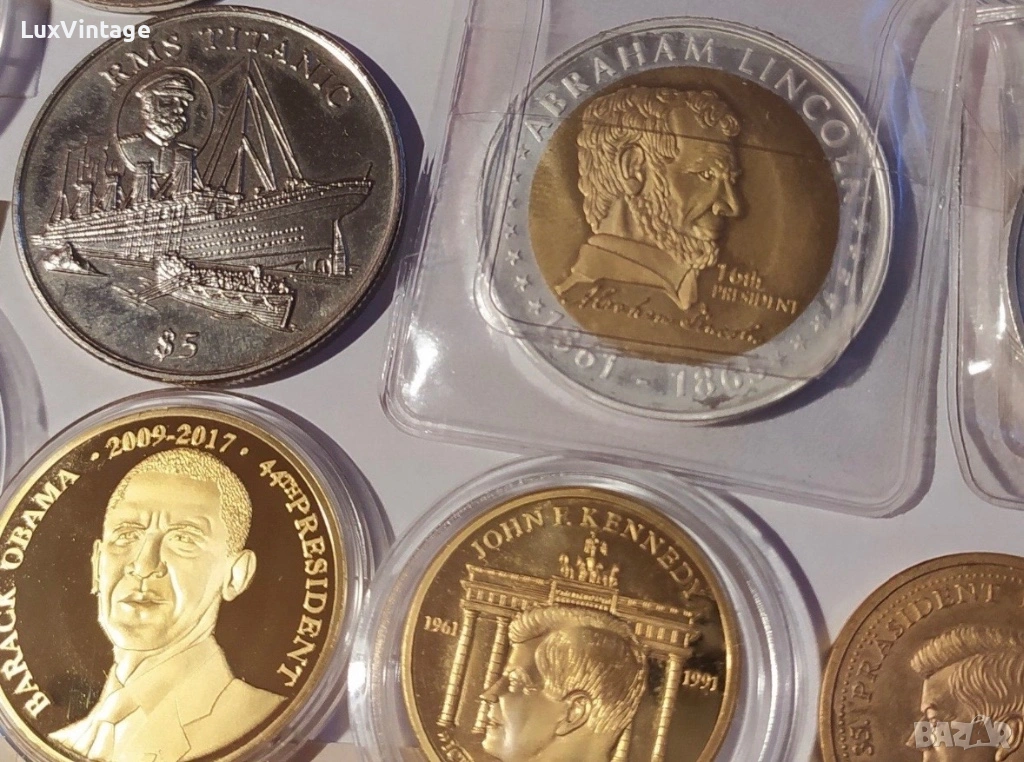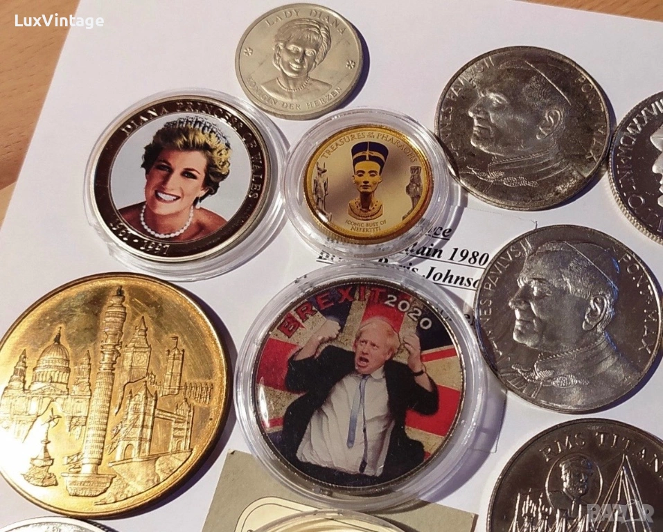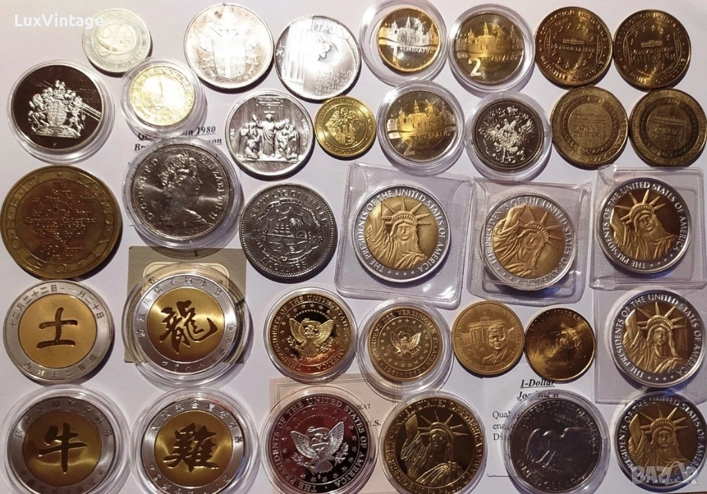 Лот 34 медали и монети от цял свят. Тематично включва: президенти на САЩ, Великобритания, Китай, Ватикана/Италия, Франция и др.