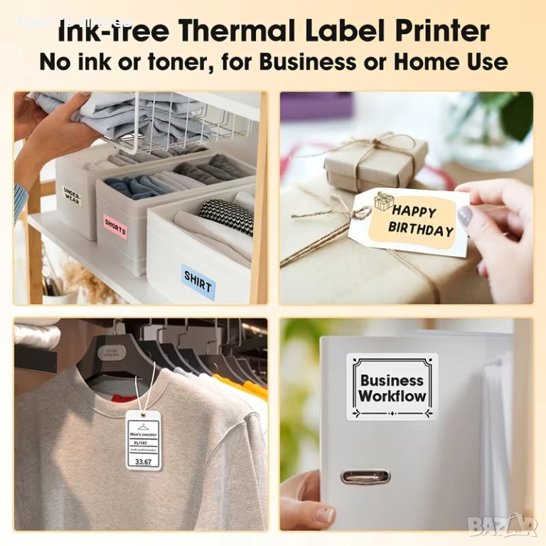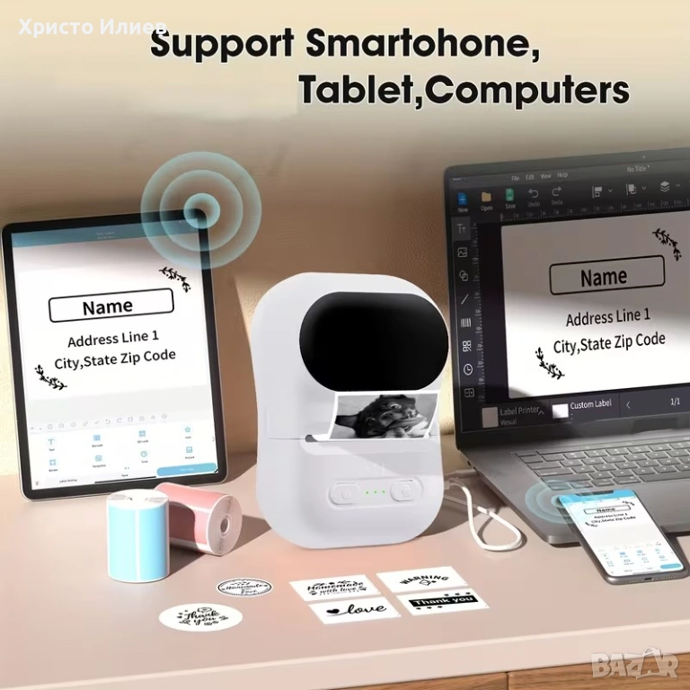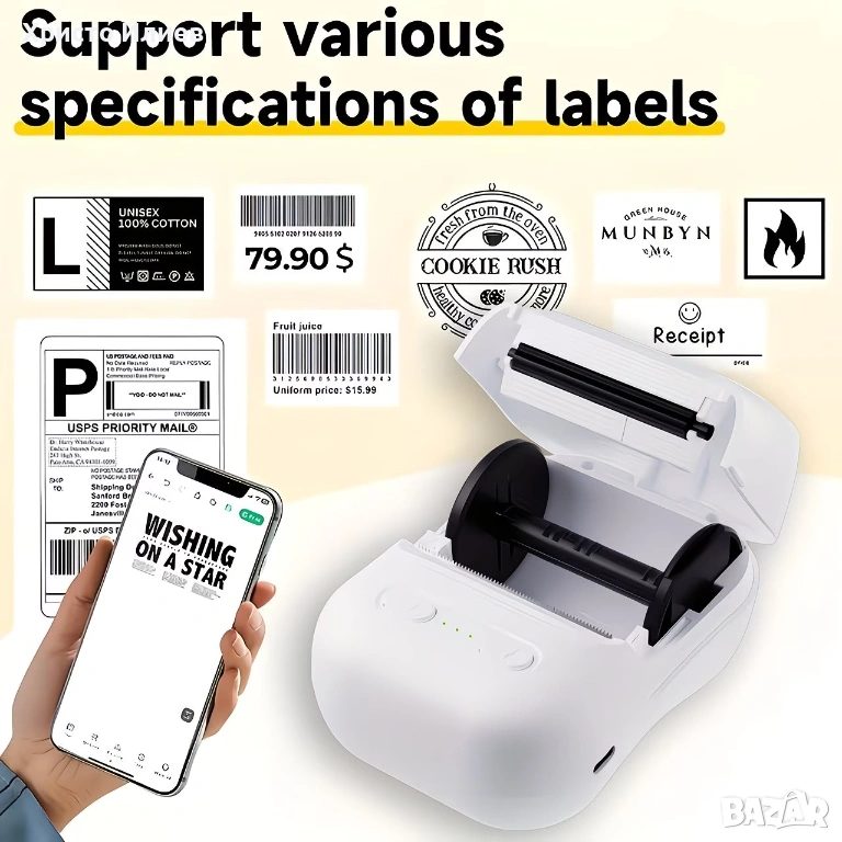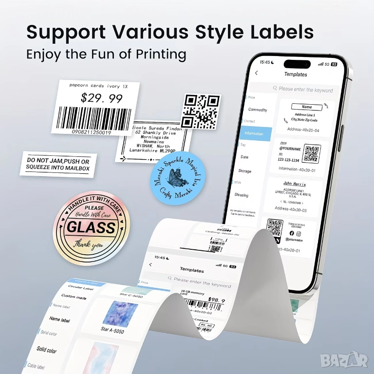 принтер за етикети, който може лесно да се свърже с вашия телефон. Нашето приложение има много интересни и практични шаблони, които ви позволяват лесно да отпечатате всеки етикет, от който се нуждаете, включително