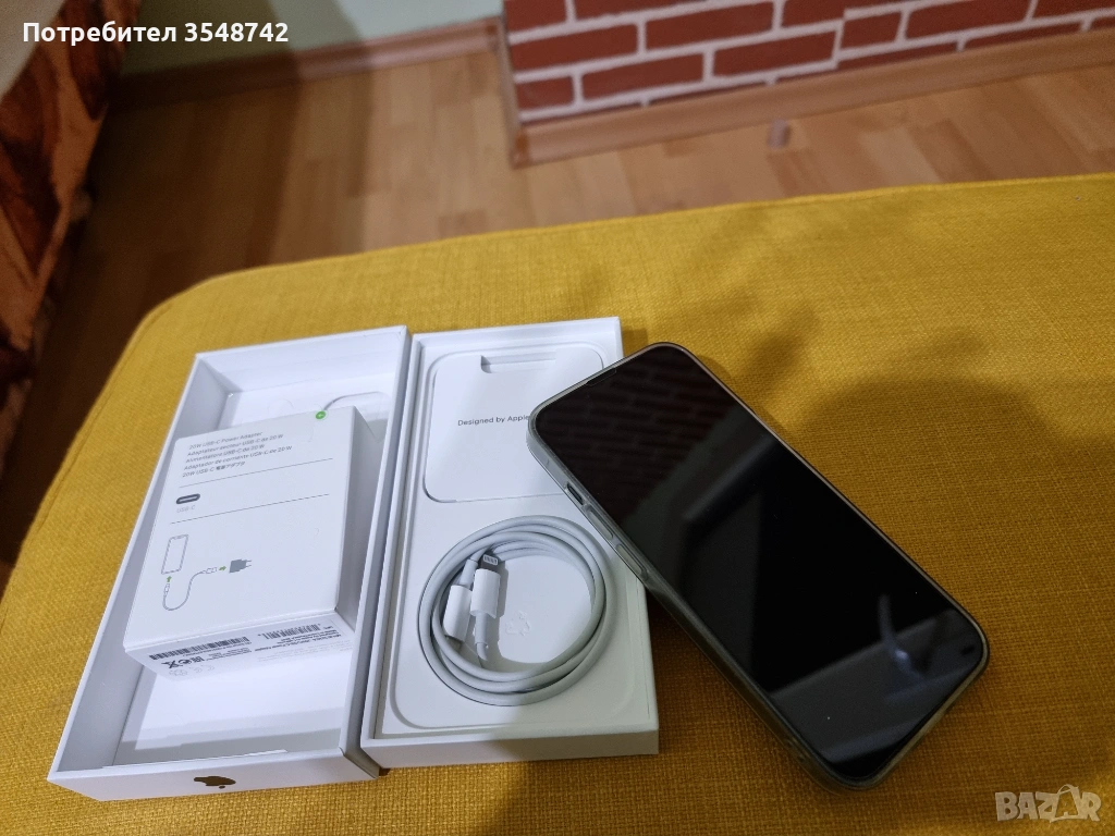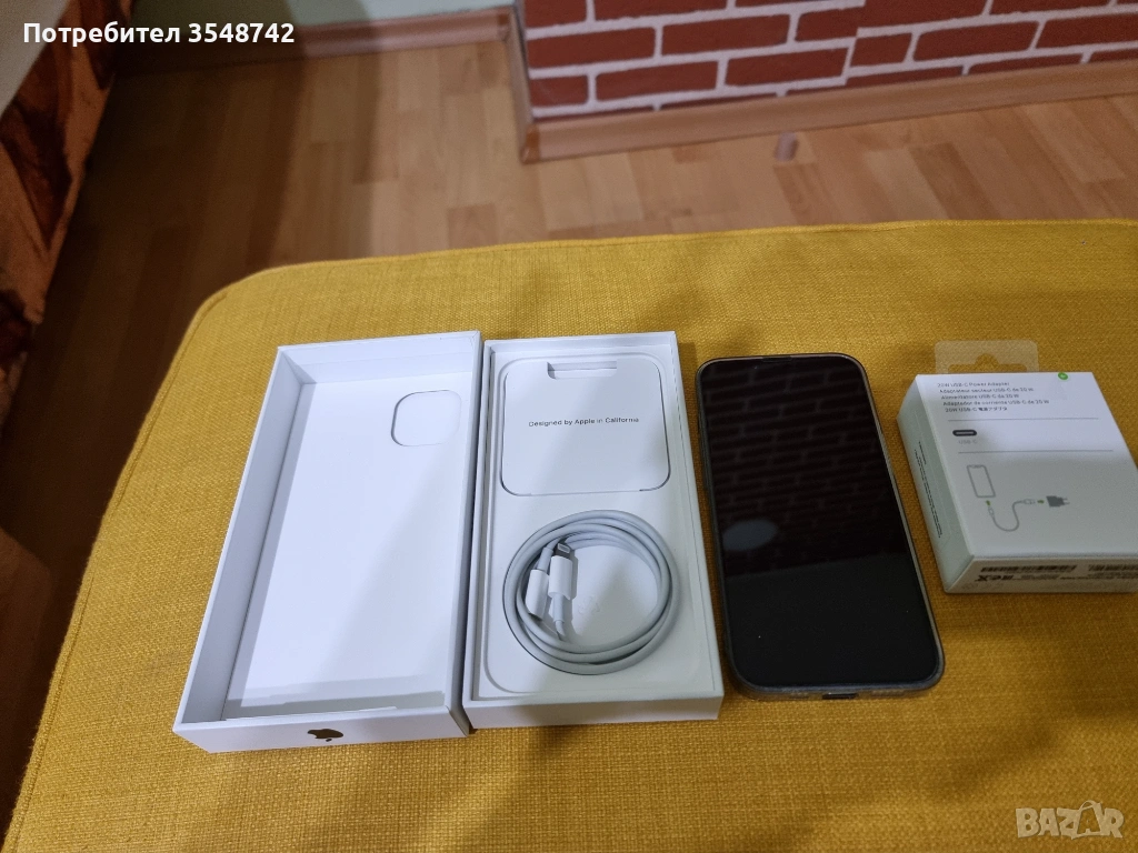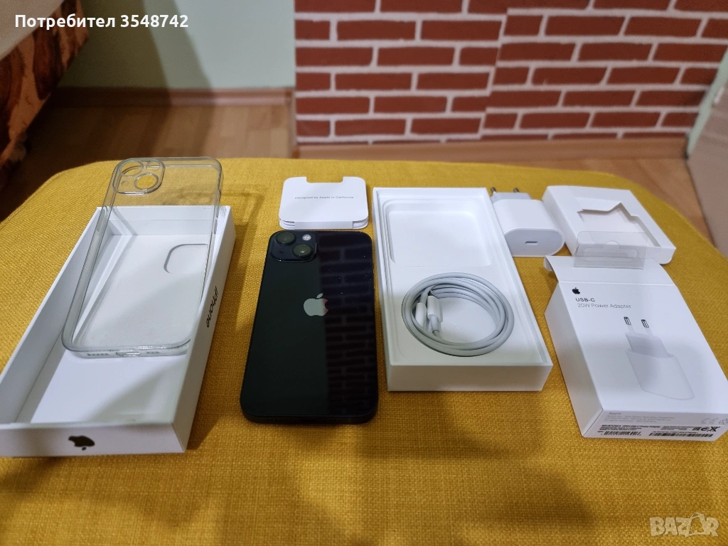 с вътрешна памет от 128G, зарядно, кабел и прозрачно калъфче. Телефонът е в