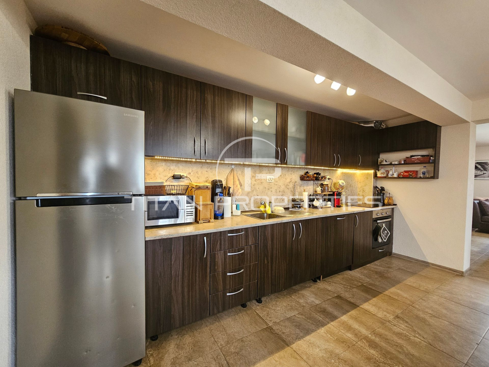 Просторна дневна с кухня и трапезария, билярдна маса, спалня, голяма баня с тоалетна със сауна и джакузи, както и просторна веранда.