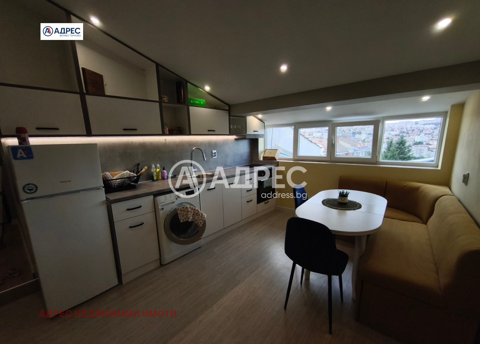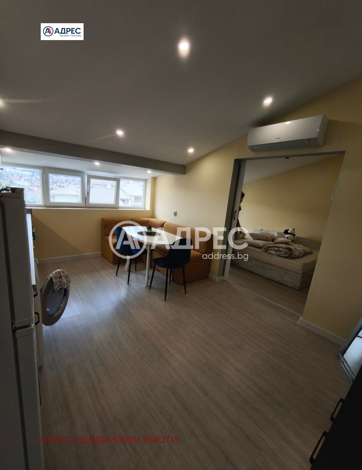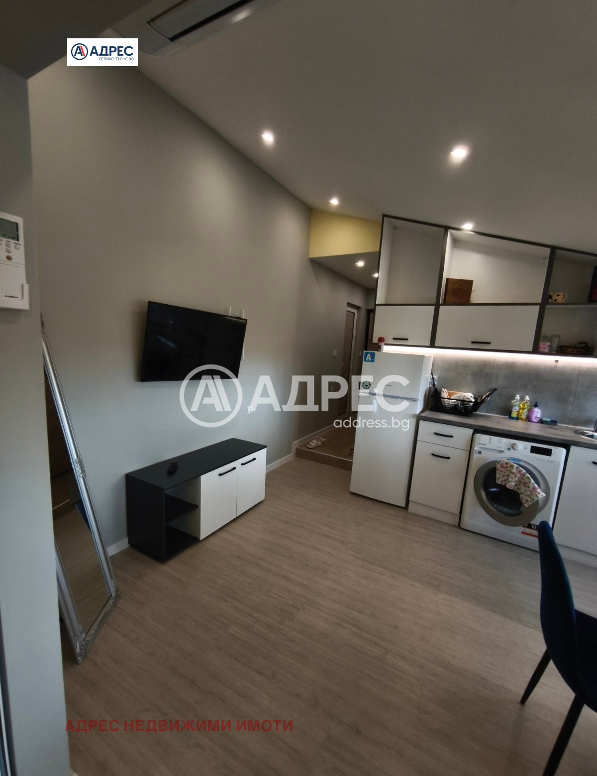 Двустаен апартамент. Адрес недвижими имоти предлага под наем уютен и функционален двустаен апартамент, разположен в предпочитан и комуникативен район. Жилището е с площ от около 50 кв.м и се намира на пети етаж в добре поддържана сграда. Състои се от светла всекидневна с обособен кухненски бокс, просторна спалня, баня, тоалетна, килер. Всекидневната е обзаведена с удобен диван, холна маса, ТВ шкаф и трапезна маса със столове. Кухнята е оборудвана с всички необходими електроуреди хладилник, фурна, котлони, абсорбатор и пералня. Спалнята разполага с голямо легло, гардероб и нощни шкафчета. Жилището е след освежителен ремонт, с поддържани общи части и добра изолация, което осигурява ниски разходи за отопление. Отоплението е на климатик, а изложението гарантира много естествена светлина през целия ден. Локацията предлага бърз достъп до градски транспорт, магазини, училища, детски градини и зелени площи.
