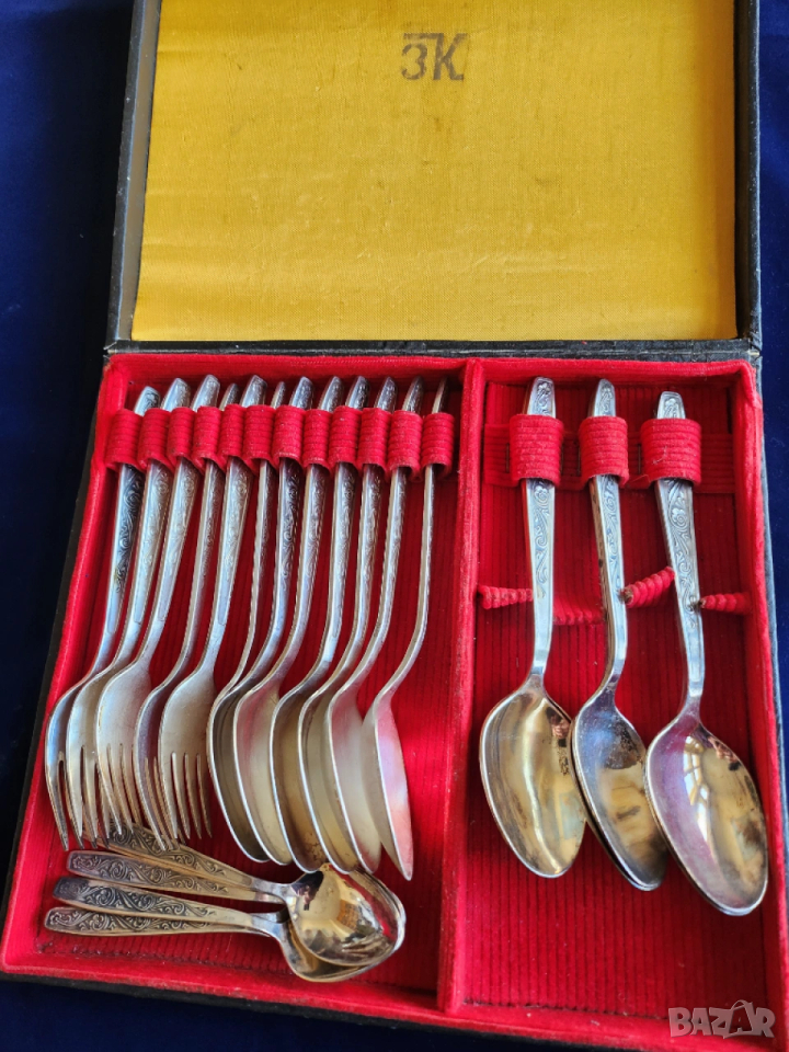 1) Предлагам прибори от мелхиор, фабрично дълбоко посребрени , красиви и солидни. С патина от времето, неползвани .