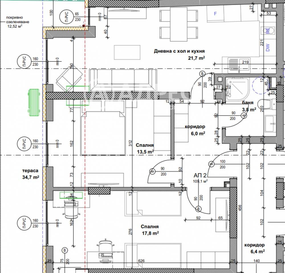 Тристаен апартамент с западно изложение, състоящ се от всекидневна с кухненски бокс, две спални с гардеробна, баня с тоалетна и тераса 35кв.м.
