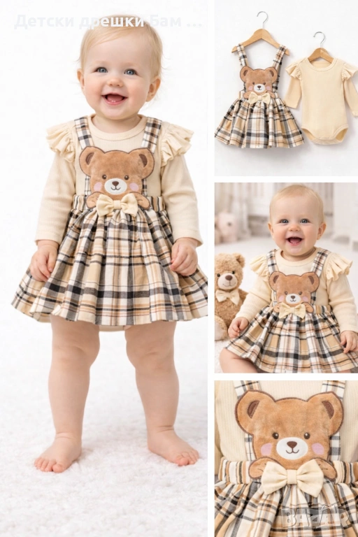 Очарователен комплект за бебе момиче, състоящ се от карирана рокля с апликация мече и рипсено боди с дълъг ръкав.