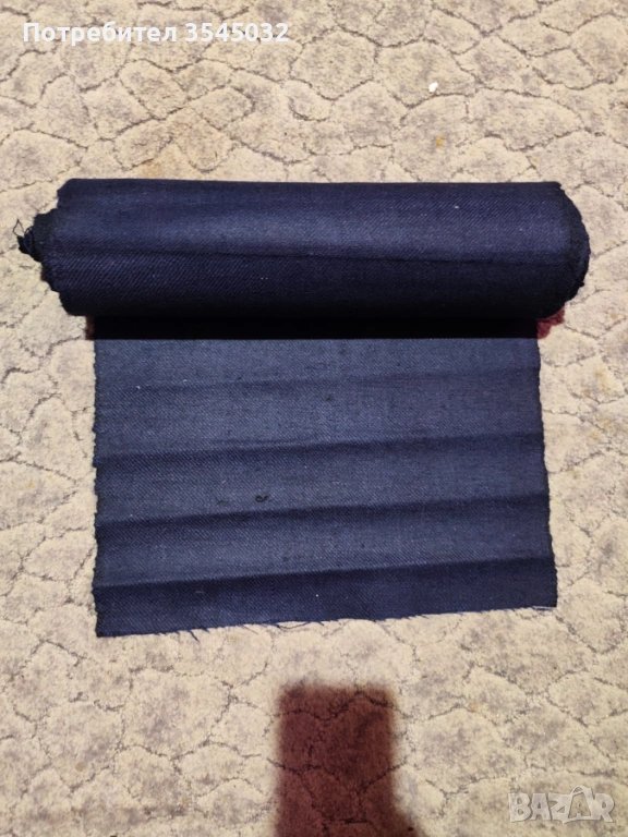 Тъмно син вълнен плат. Тънък е и може да се използва за ушиване на елеци. Дължина 3м, широчина 40см.