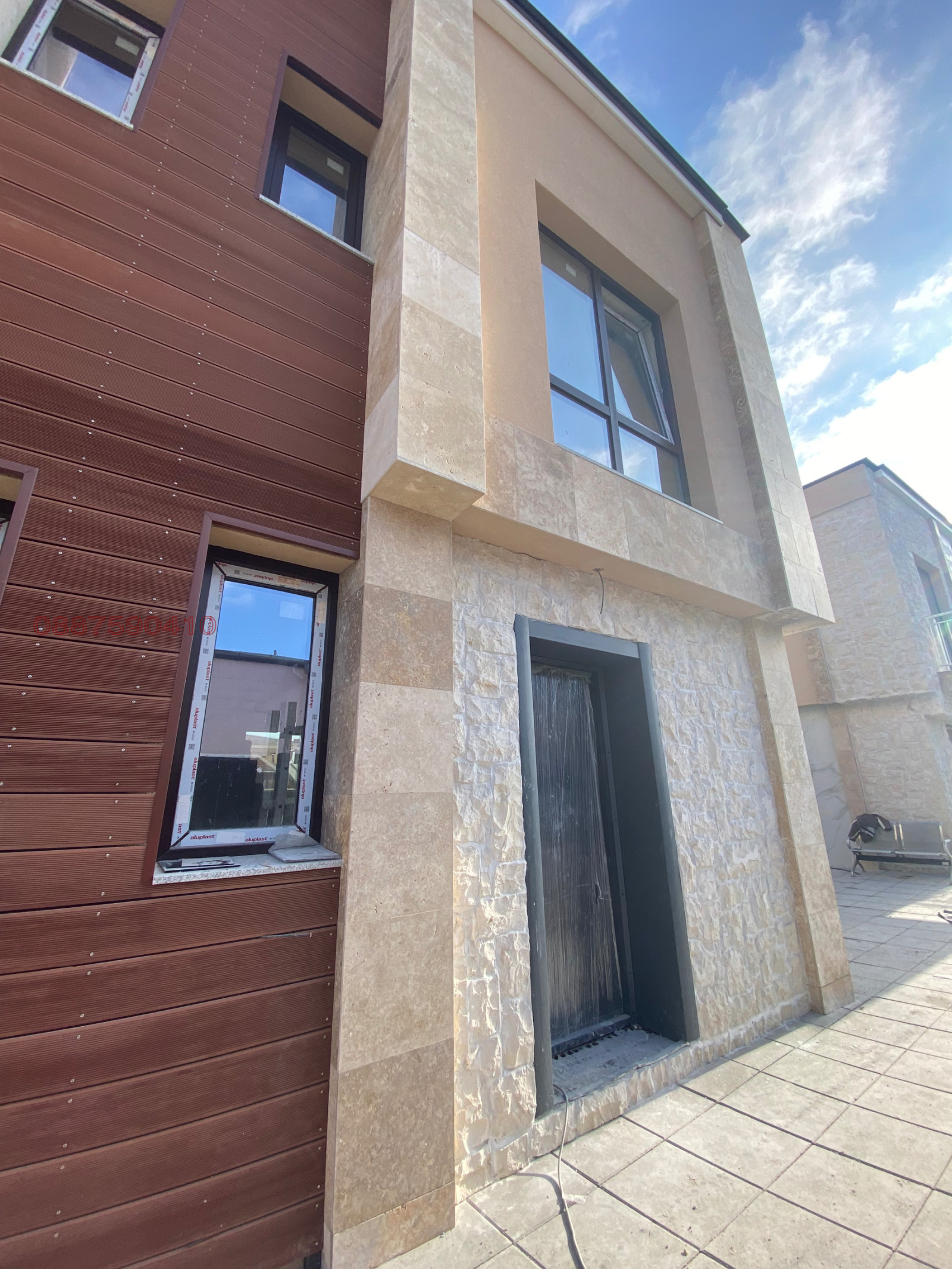 2- ри етаж- 2 спални,коридор, баня. Изпълнена с високо качествени материали, облицовки по фасади от травертин, мрамор, немски композитен декинг, озеленен двор и облицована веранда, тухли Винебергер, баумит изолация 10см на подове и стени, силиконова мазилка Баумит, безшевни улуци, блиндирана врата., на шпакловка и замазка.