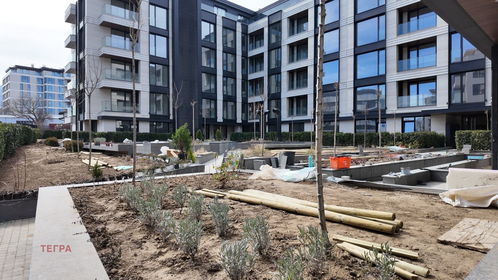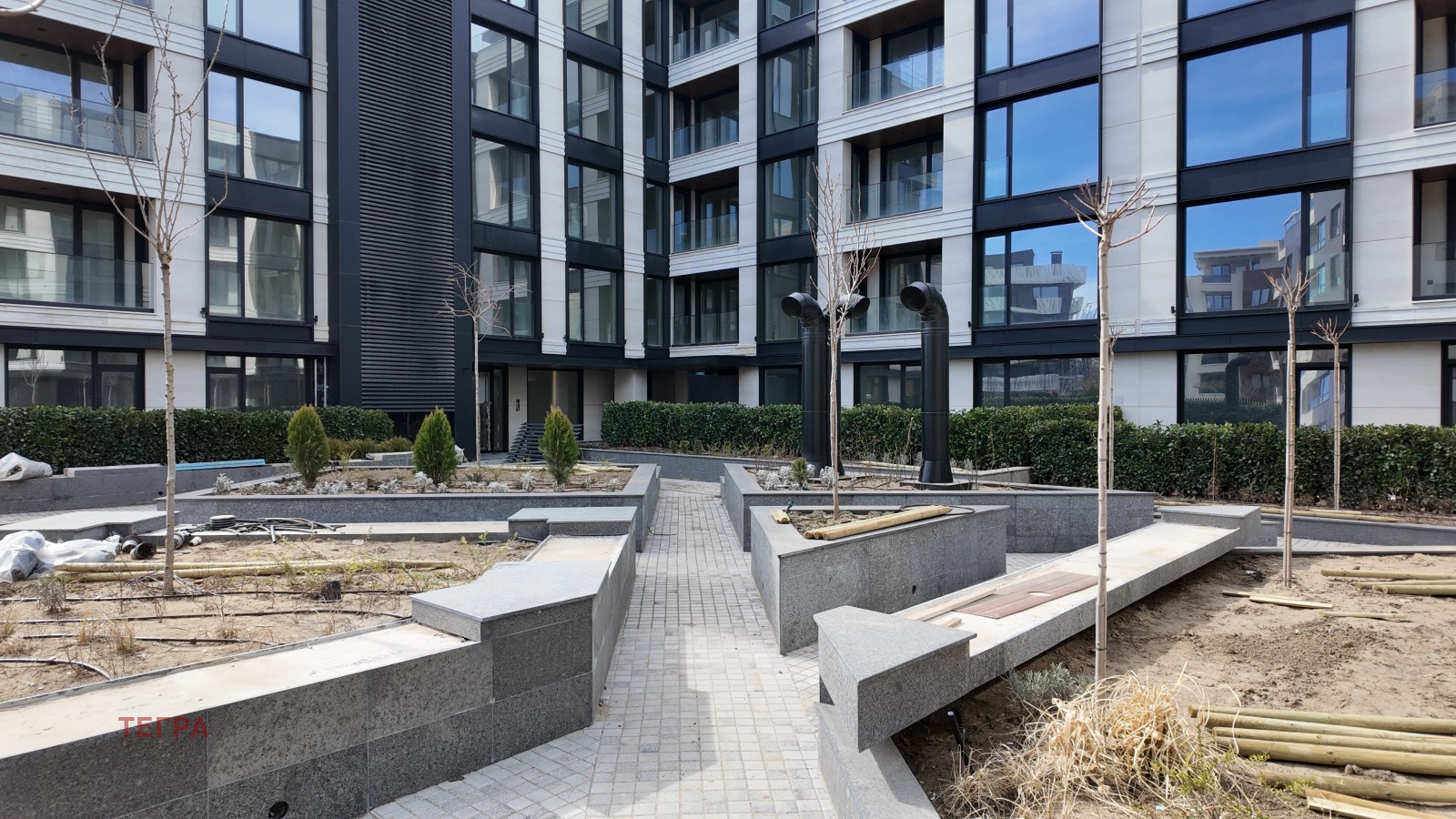 Комплексът предлага богат вътрешен озеленен двор, представителна рецепция и четири жилищни входа. Подземен паркинг на две нива, с възможност за закупуване на паркомясто и гараж, осигурява удобство за живущите. Tegra е отлично позициониран в близост до предстояща метро станция, търговски център Paradise Mall, частни училища и природен парк Витоша, предлагайки както комуникационни предимства, така и възможности за отдих.