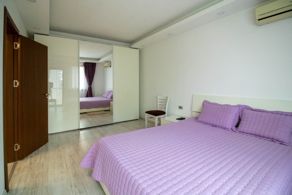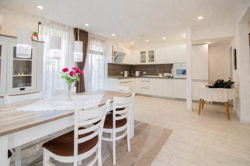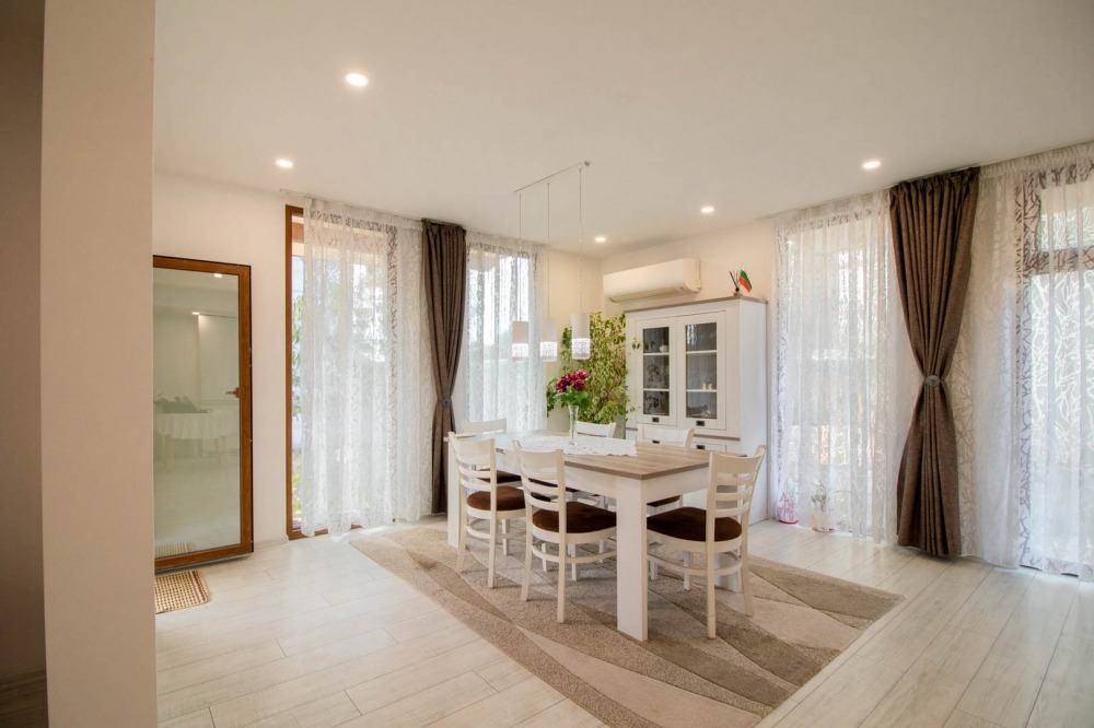 Разпределение: входно антре, голяма всекидневна с обособени кухненски кът, трапезария и кът за отдих с мека мебел, баня с тоалетна, килер, голяма веранда с излаз от всекидневната, мокро помещение и топла връзка към гаража. Вътрешни стълби водят към втория етаж където са разположени три спални, една от които с дрешник, баня с тоалетна и тераса с излаз от двете спални. Стаите са светли и просторни!