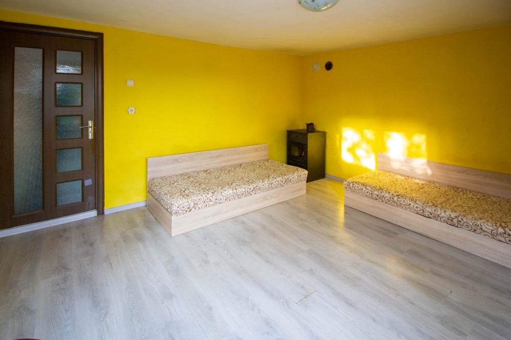 Разпределение - Първи етаж - коридор, спалня, кухня и баня с тоалетна, отопление с два климатика. Втори етаж - антре, хол със спалня с веранда, втора спалня, отопление с камина.