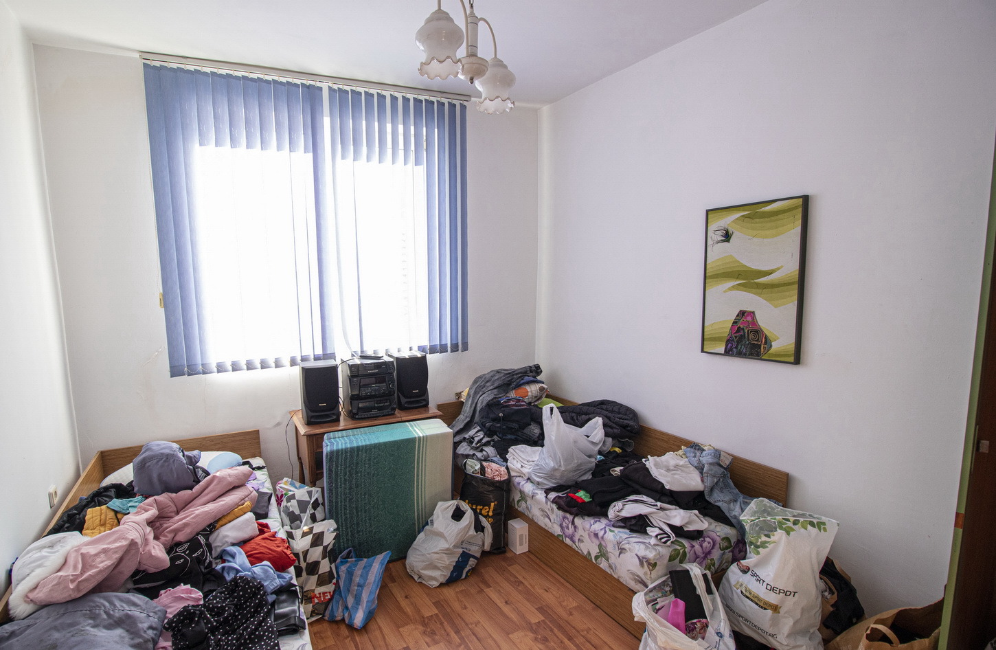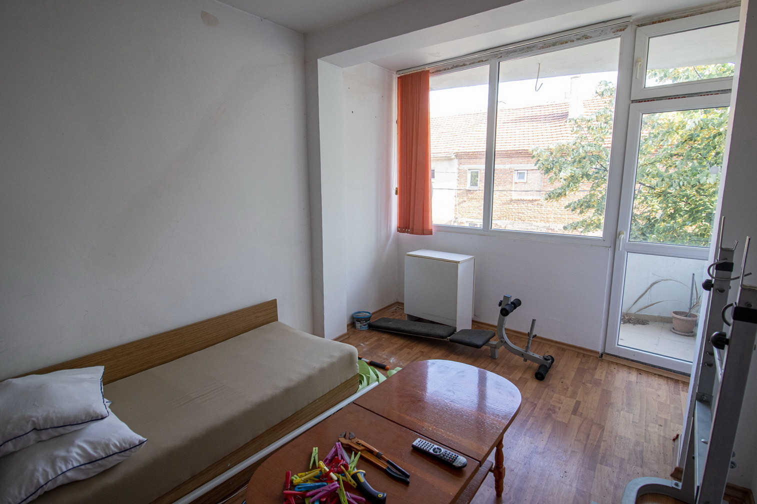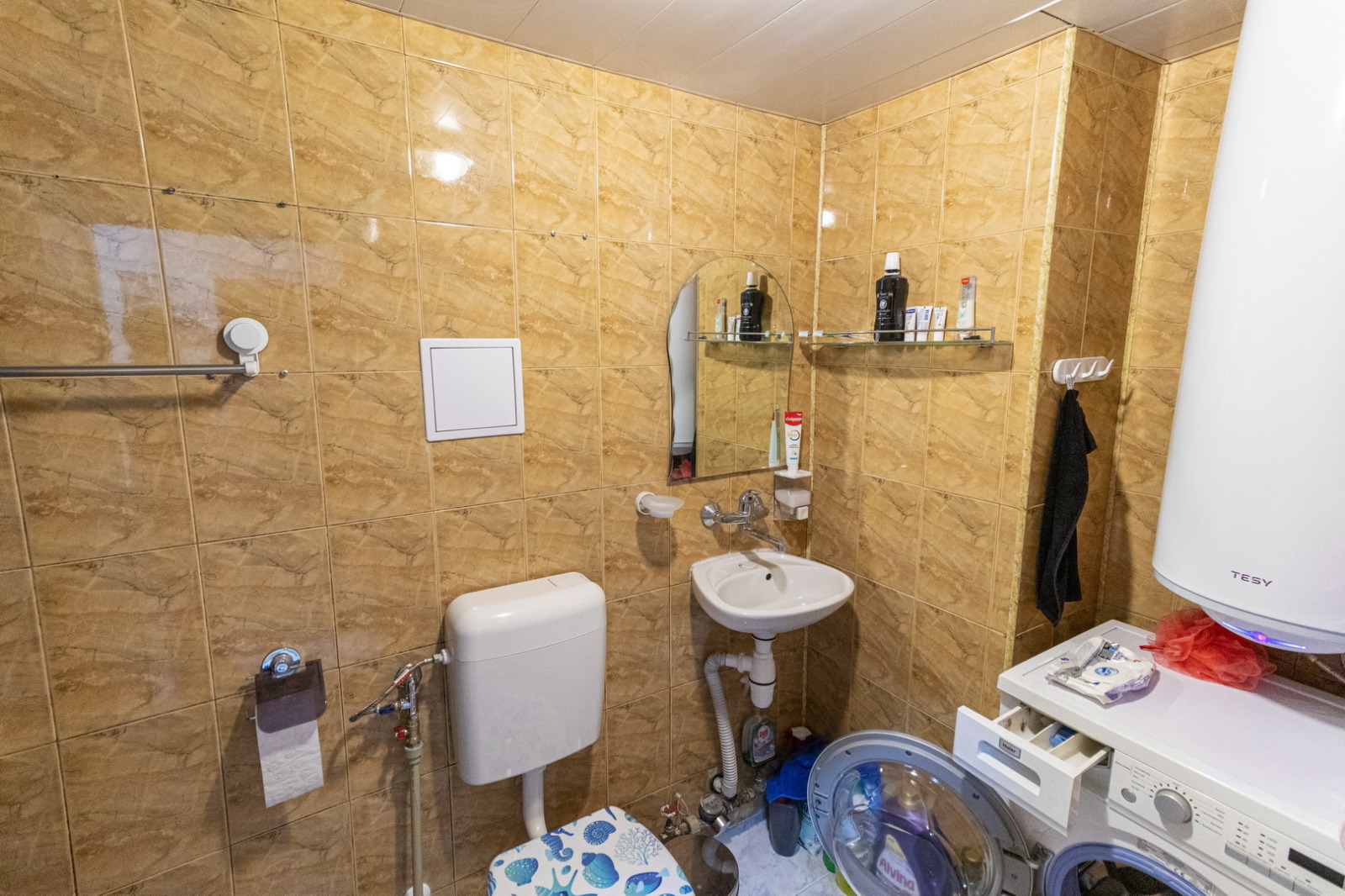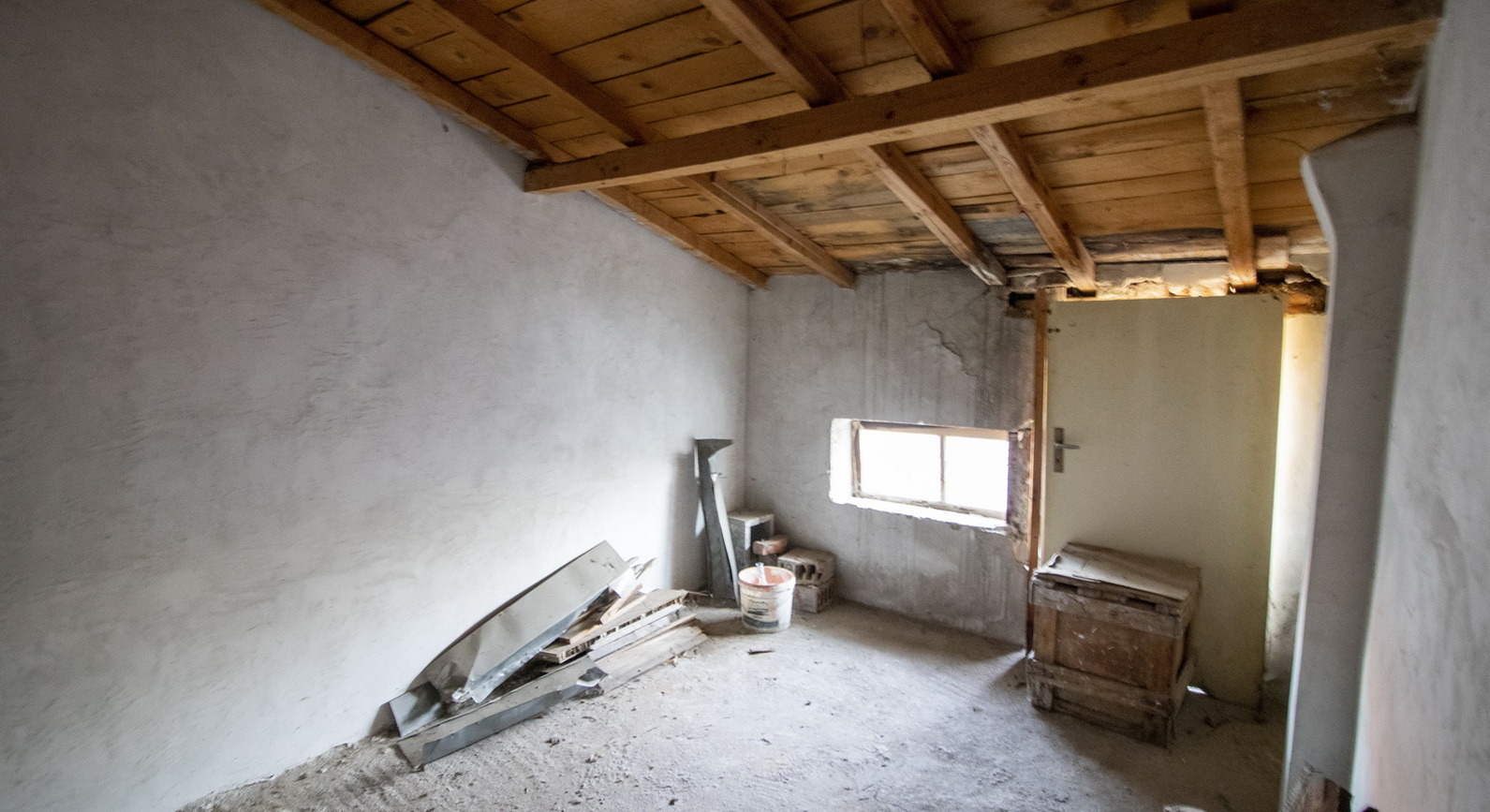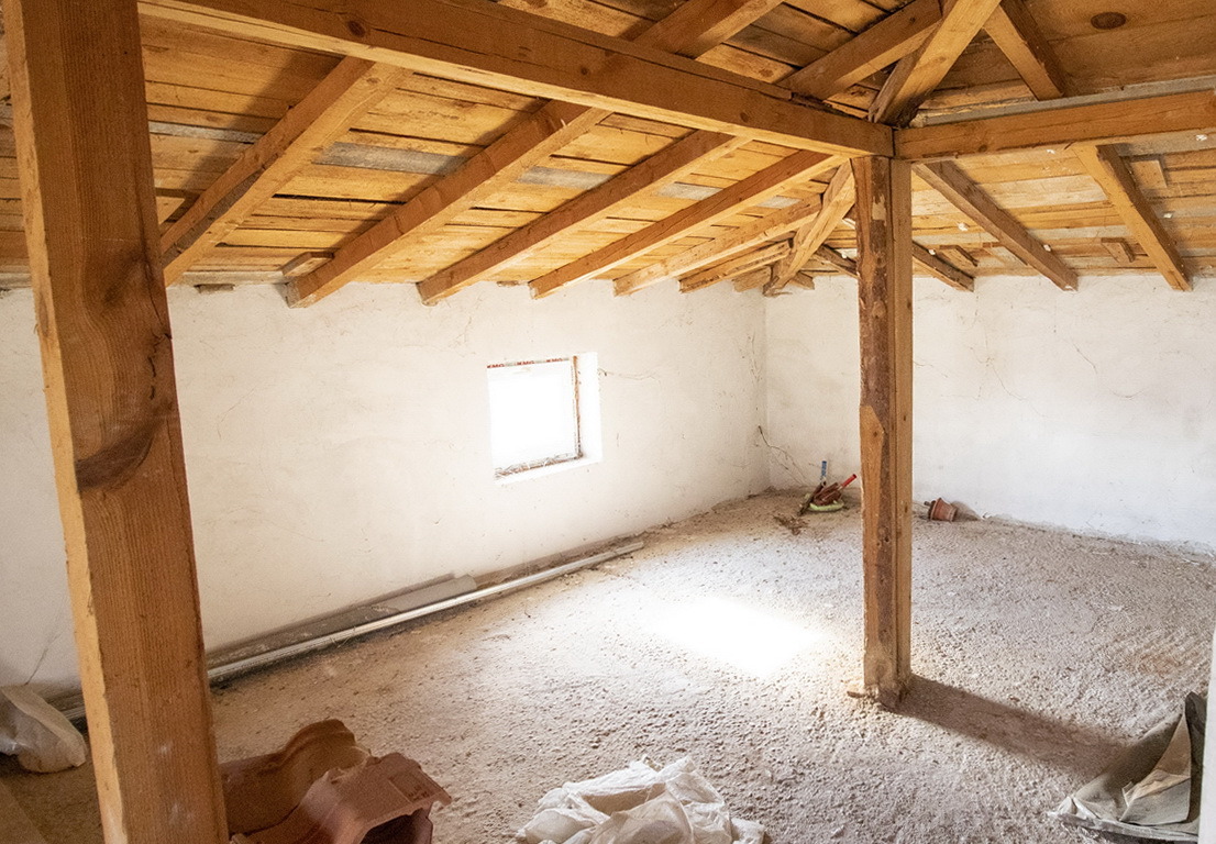 Таванското помещение е разпределено в три стаи и санитарен възел и може да се пригоди за живеене.