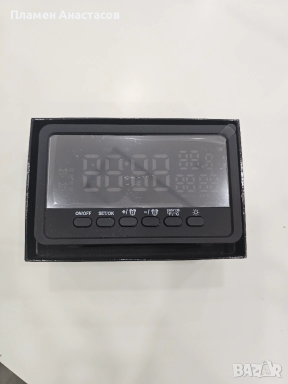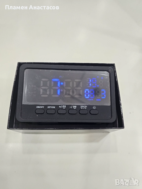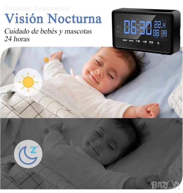 Освен функцията за наблюдение, устройството работи и като пълноценен дигитален часовник с аларма, което го прави практично и функционално устройство за всяко помещение.