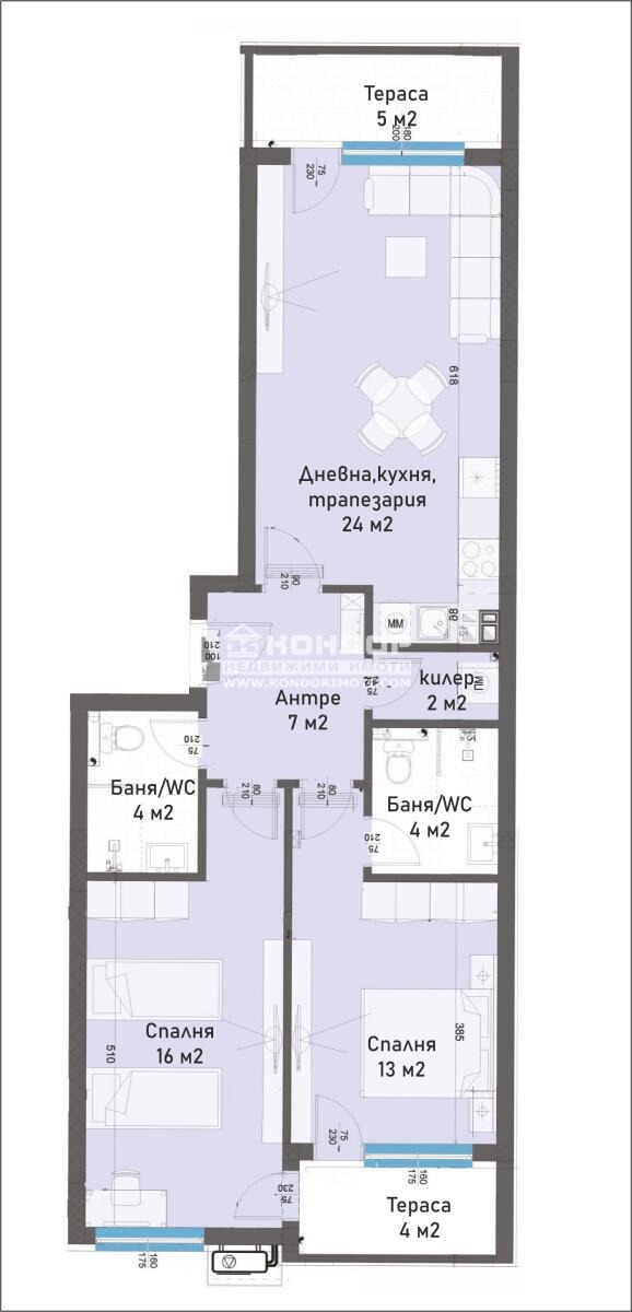 Оферта 63307 - Бутиков затворен жилищен комплекс с модерна и устойчива архитектура, потопена в богато озеленени площи, вдъхващи на живущите комфорт и спокойствие. Комплекса предлага просторна спокойна среда с бърз достъп до центъра на града, както и възлови булеварди. Предлагаме ви тристаен апартамент с просторна слънчева дневна 24 кв.м. с трапезария и кухненска част, две прекрасни самостоятелни спални: детска 16кв.м. и родителска 13кв.м. със собствена баня, втора баня с тоалетна, широко входно антре с място за гардероб, килер/перално и две тераси. В близост са ситуирани ресторанти, хипермаркети, училища и детски градини. Ще бъдат изградени луксозни общи части с предоставено облагородено дворно място, пейки за отдих и детски площадки за игра. Апартаментите ще бъдат издадени на: