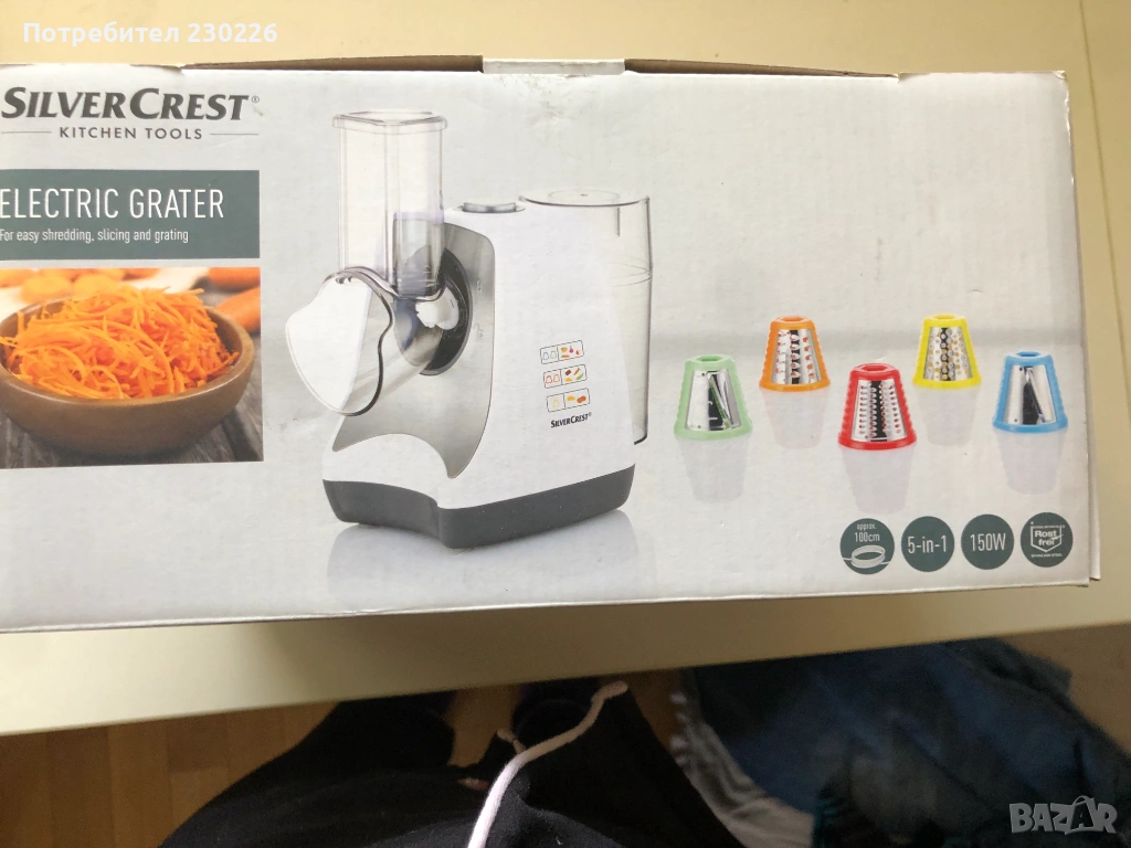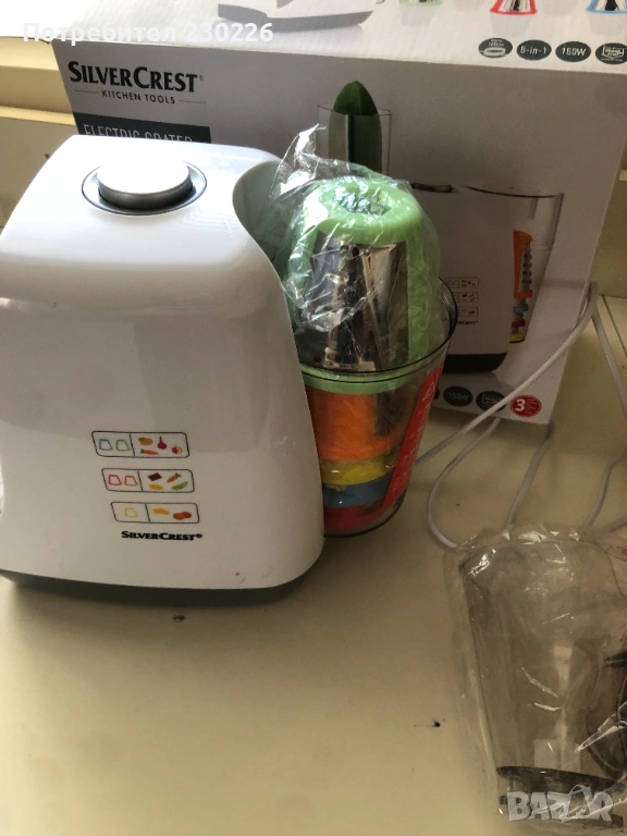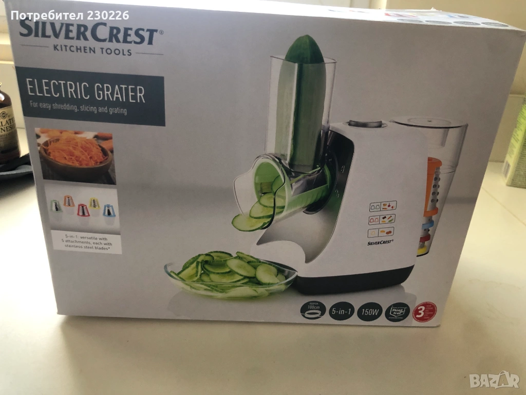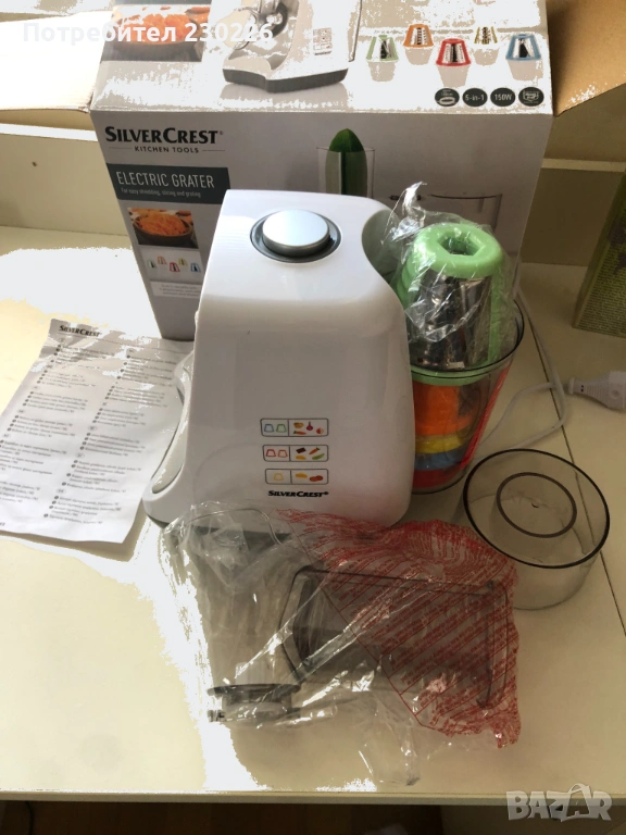 Продавам чисто ново, неизползвано електрическо ренде SilverCrest Kitchen Tools 5 в 1 – идеално за бързо настъргване и рязане на зеленчуци, сирене, ядки и още!