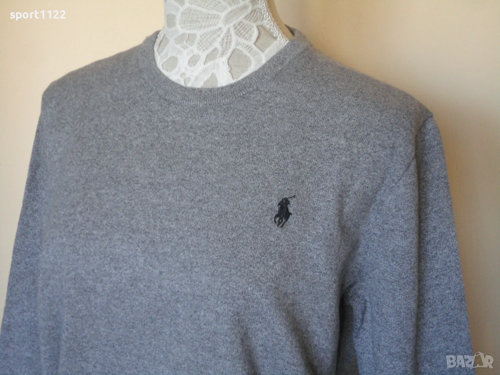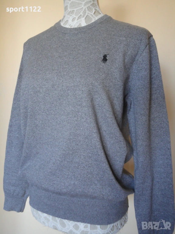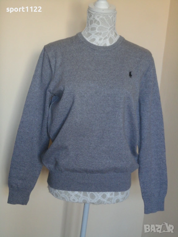 Пуловер на Polo Ralph Lauren, 100% pima cotton. Цветът е сив меланж. Не е ползван, но е без хартиен етикет. По етикет е размер S, но е свободна кройка, става и за M.