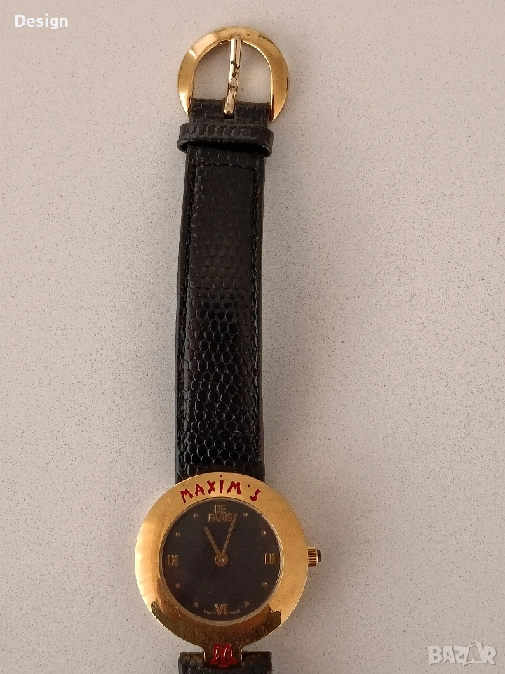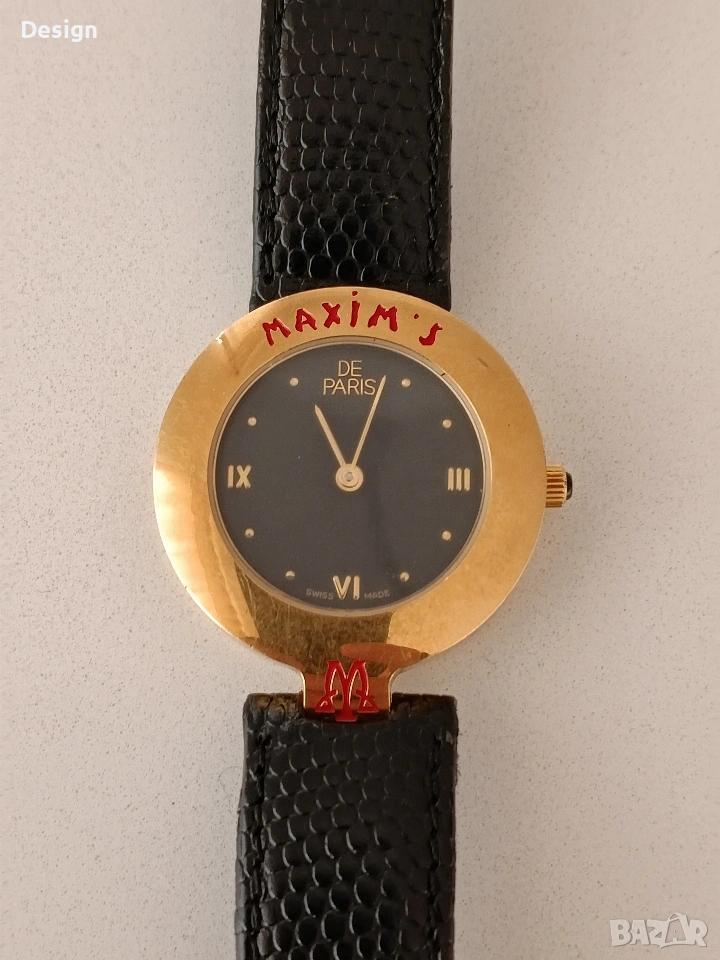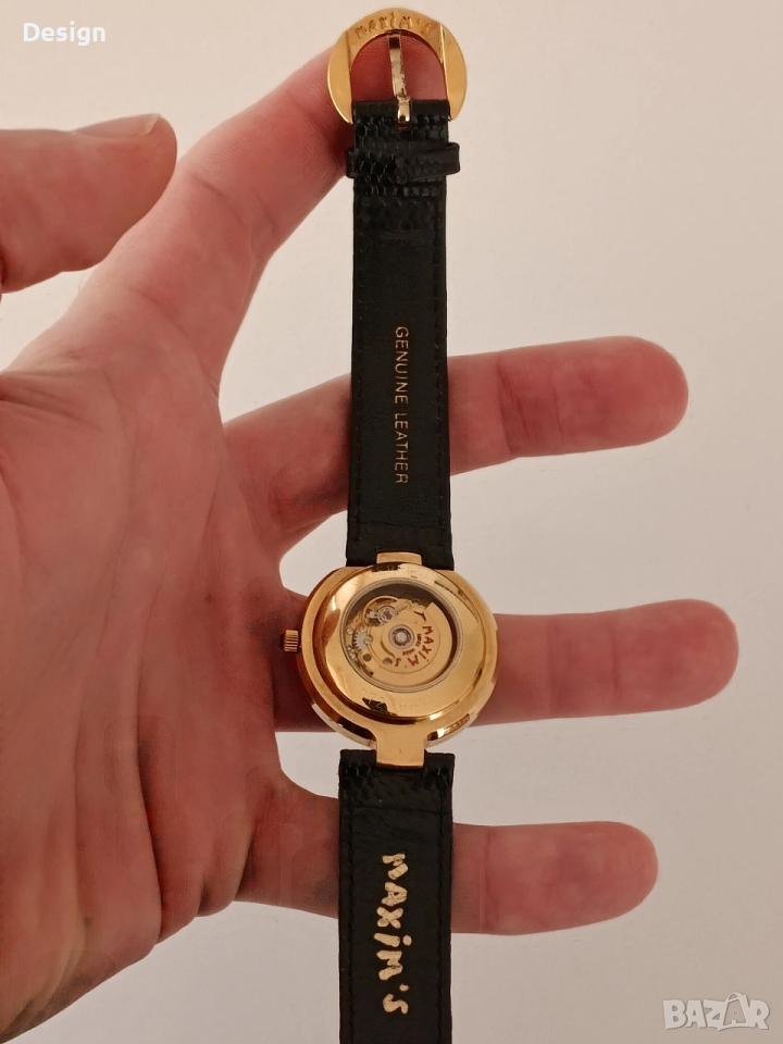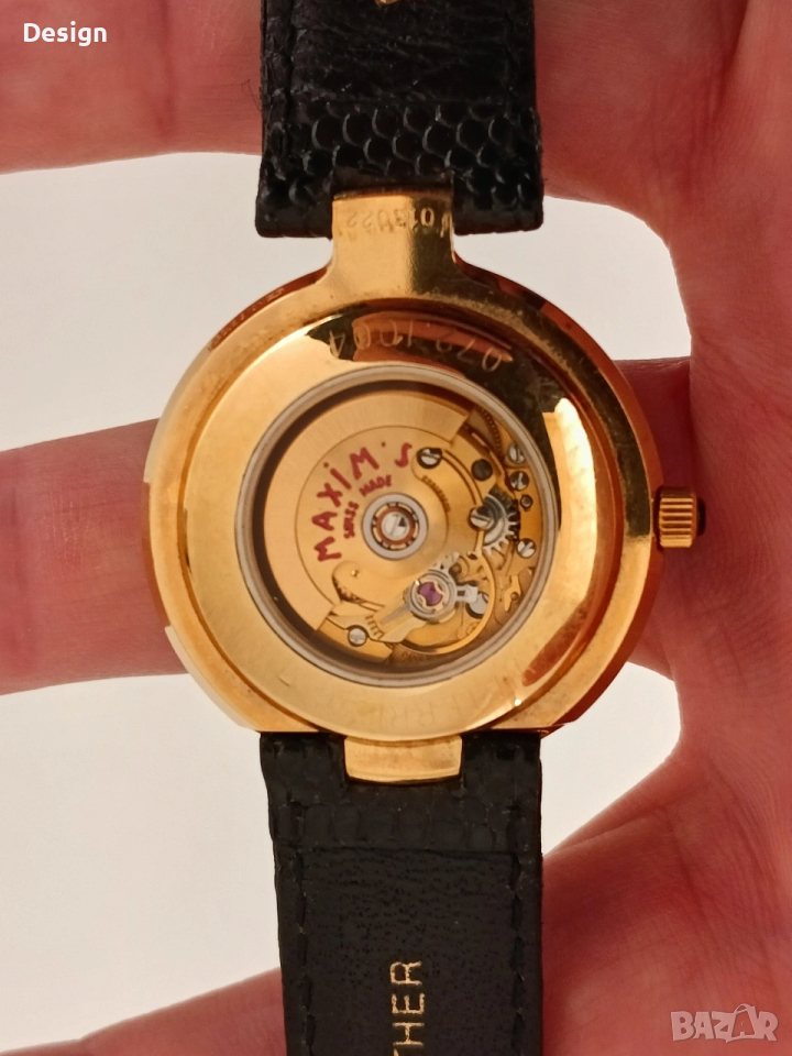 Швейцарски часовник автоматик Maxim's. Марката е на емблематичното заведение в Париж. Часовникът е с позлата и оригиналната кожена каишка.