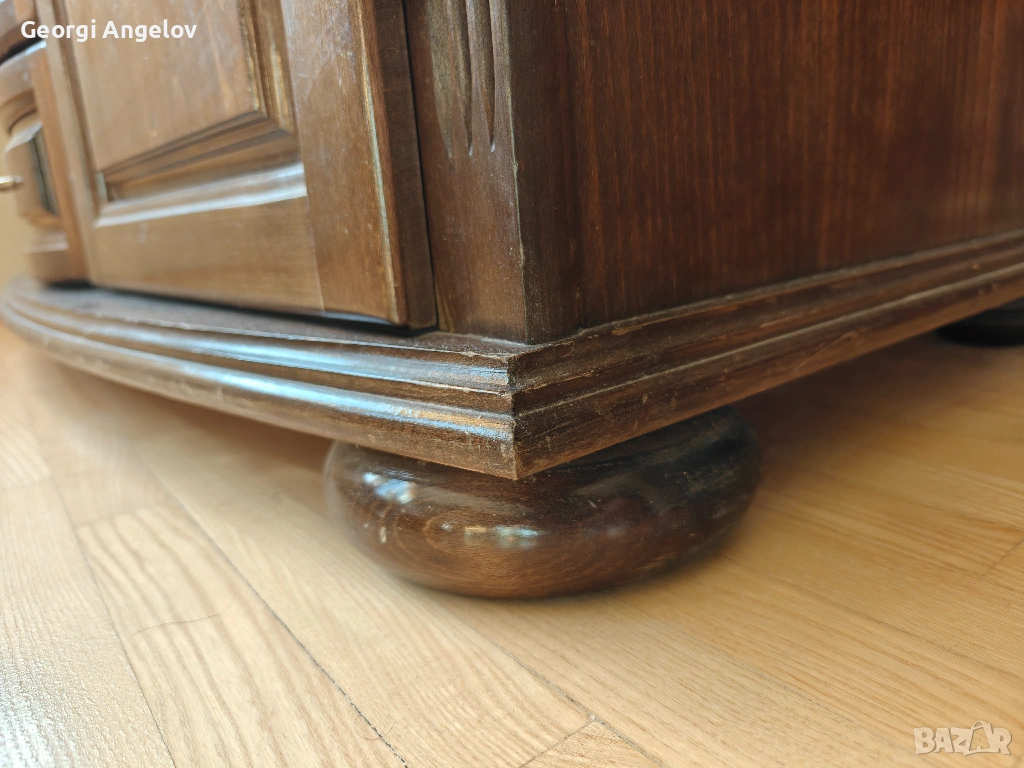 Дизайн: Отличава се с извити вратички и чекмеджета, масивни крачета тип "топка" и декоративни вертикални улеи. Дръжките са метални, сребристи и удобни.