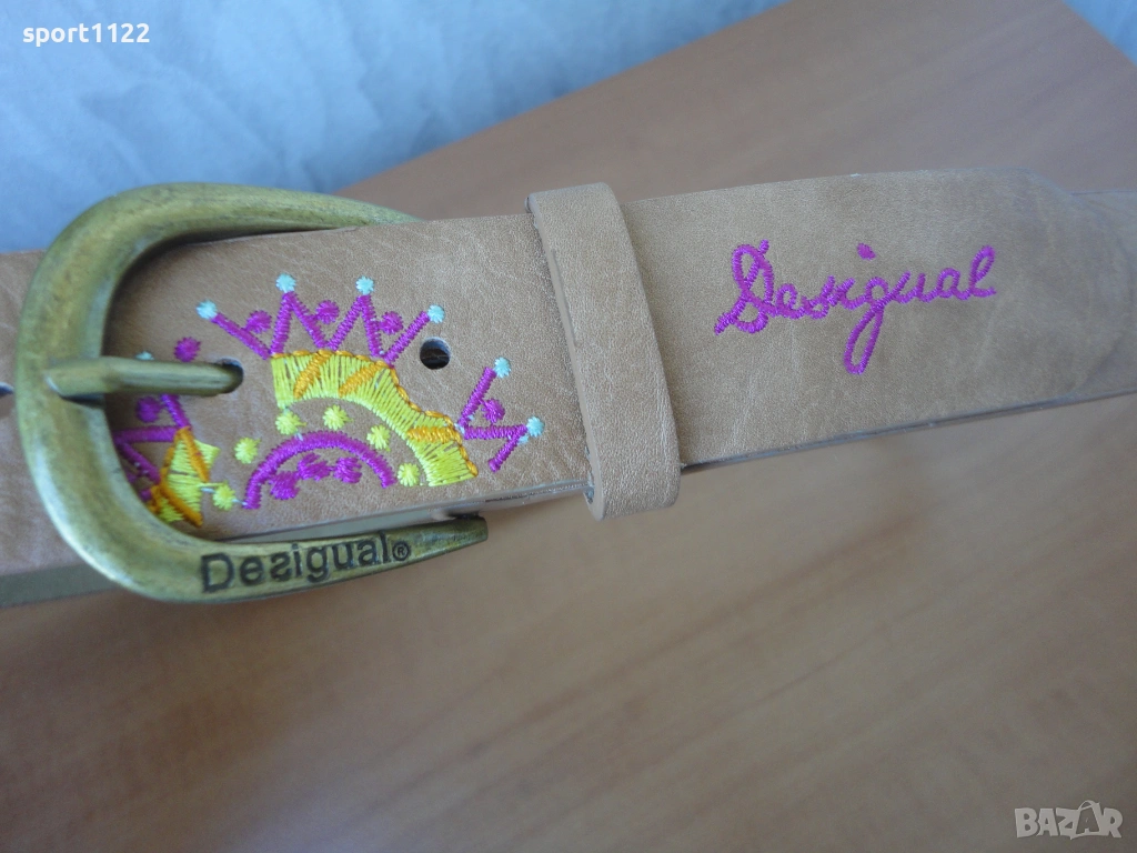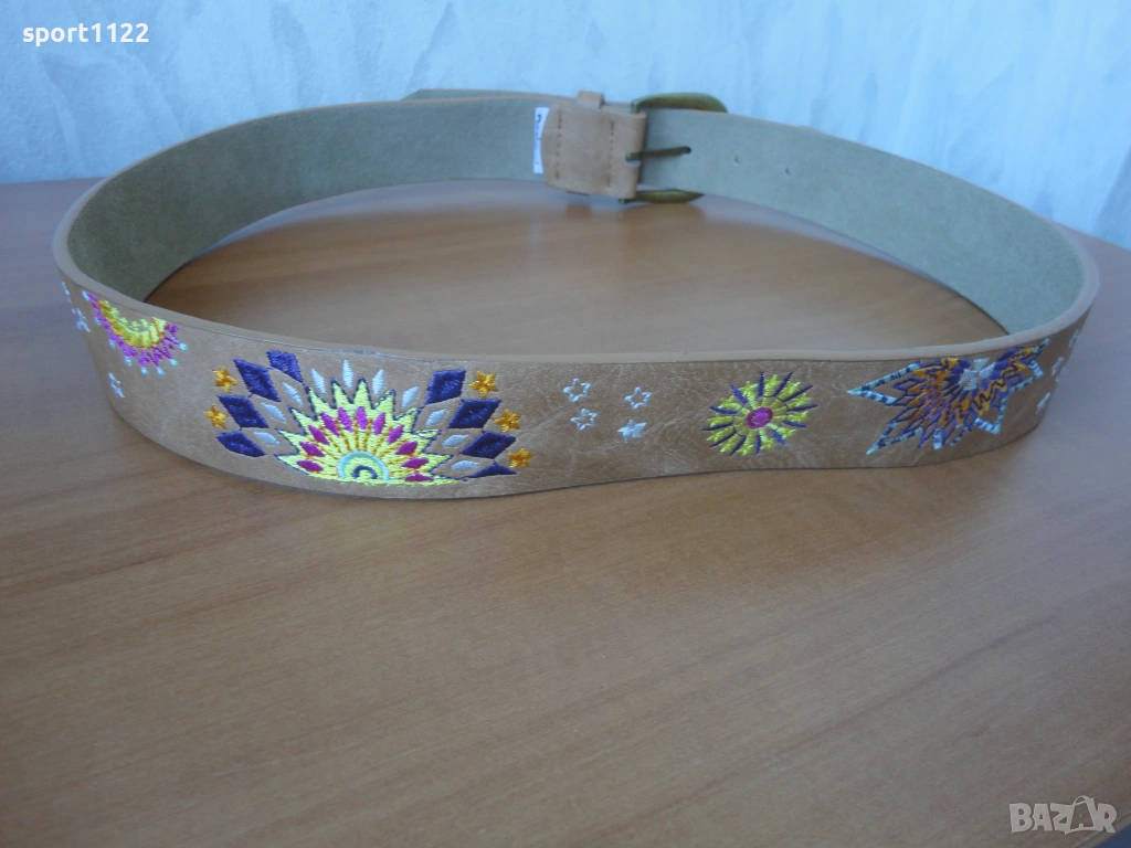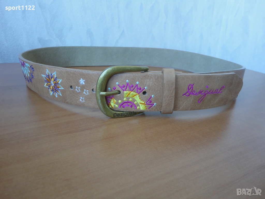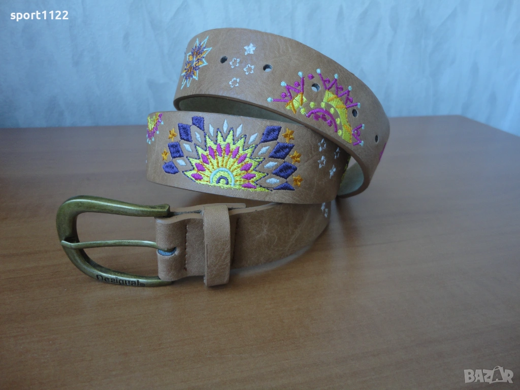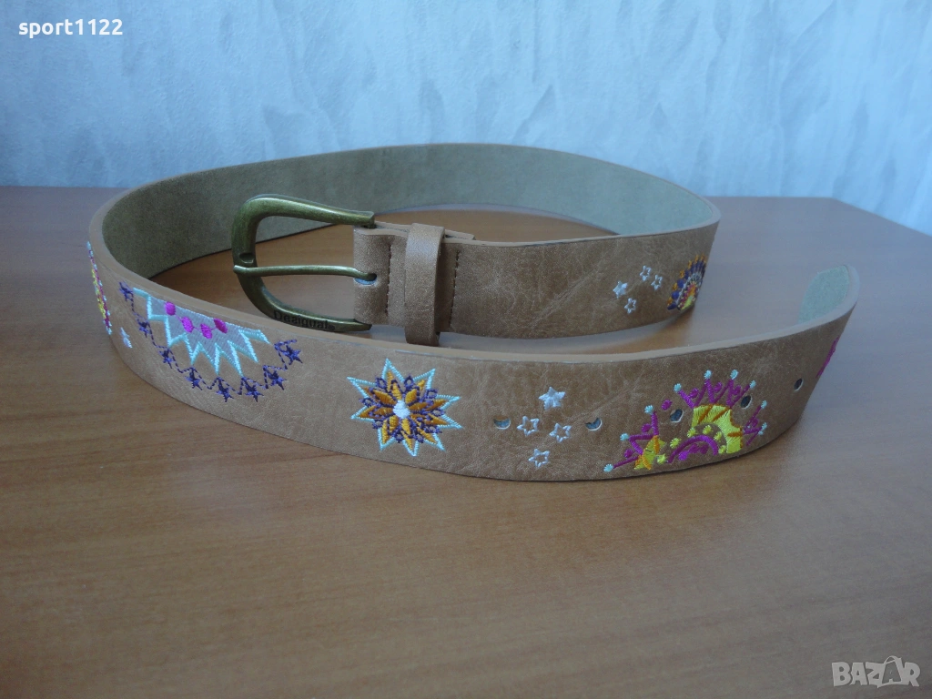 Колан Desigual, като нов, без забележки, само с отрязан етикет. От синтетична кожа, бежов цвят, с цветни бродерии.