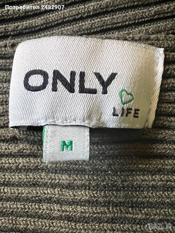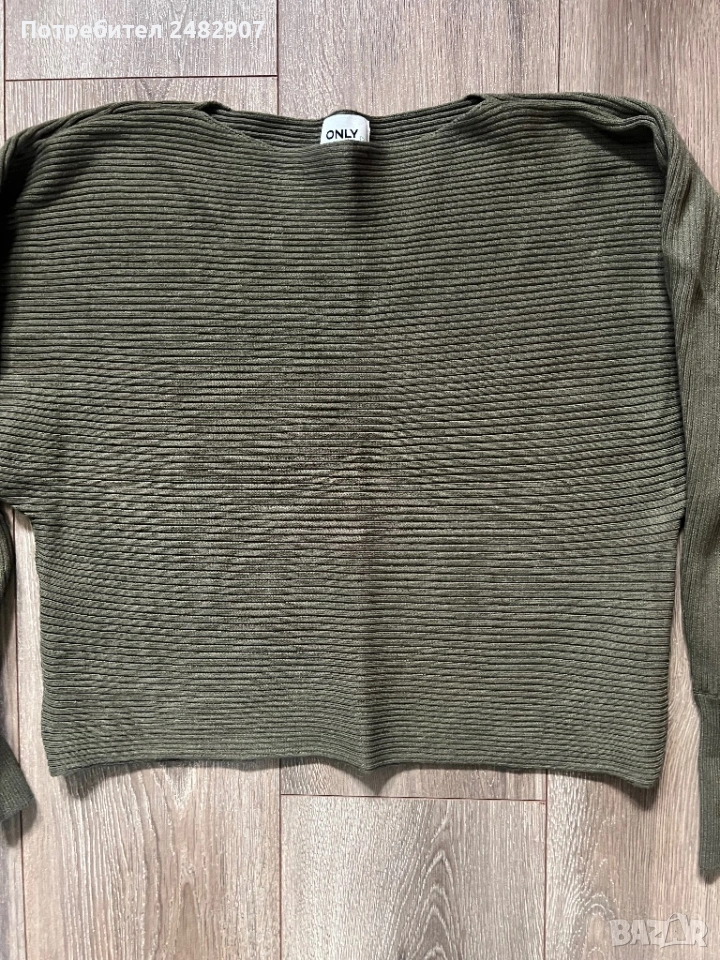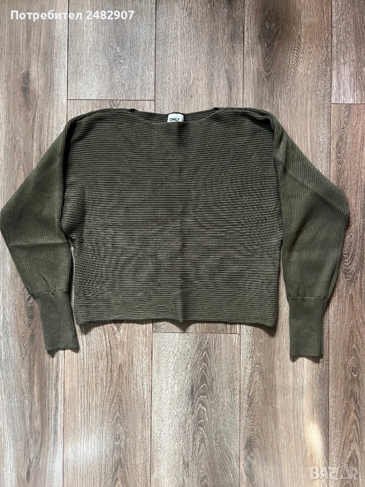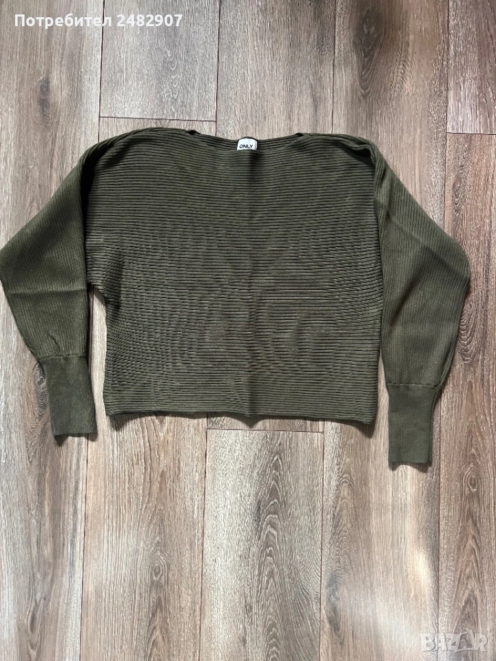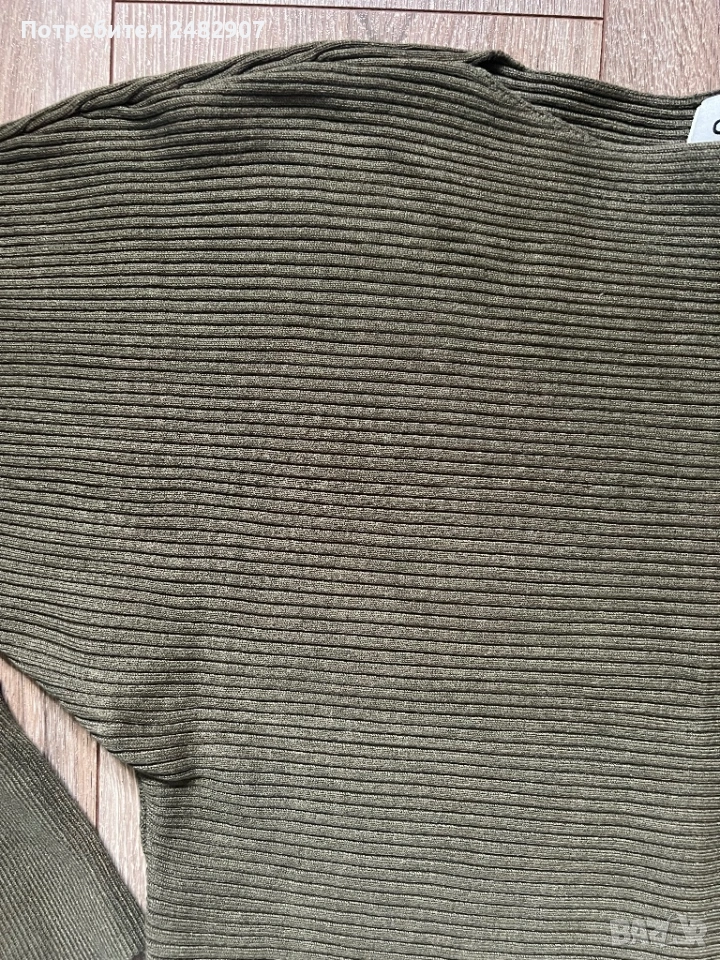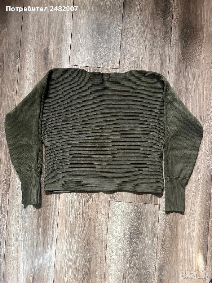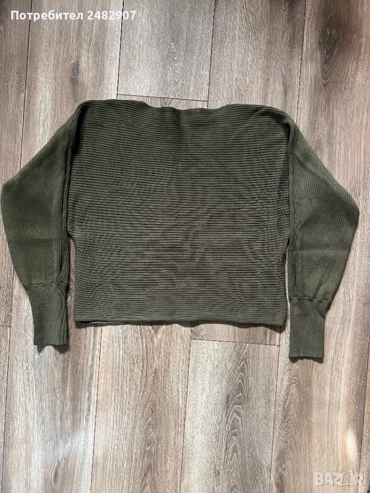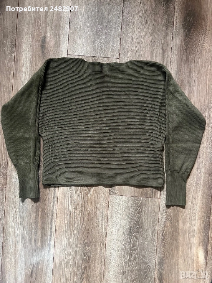 Маслено зелена машинно плетена дамска блуза, размер М. Съдържа 80 % вискоза и 20 % найлон. Ширина в долната част - 46 см, дължина от рамото до долу - 49 см, дължина на ръкава от деколтето - 66 см, ширина на ръкава в долната част - 8 см. Много запазена, почти не е използвана, без забележки.